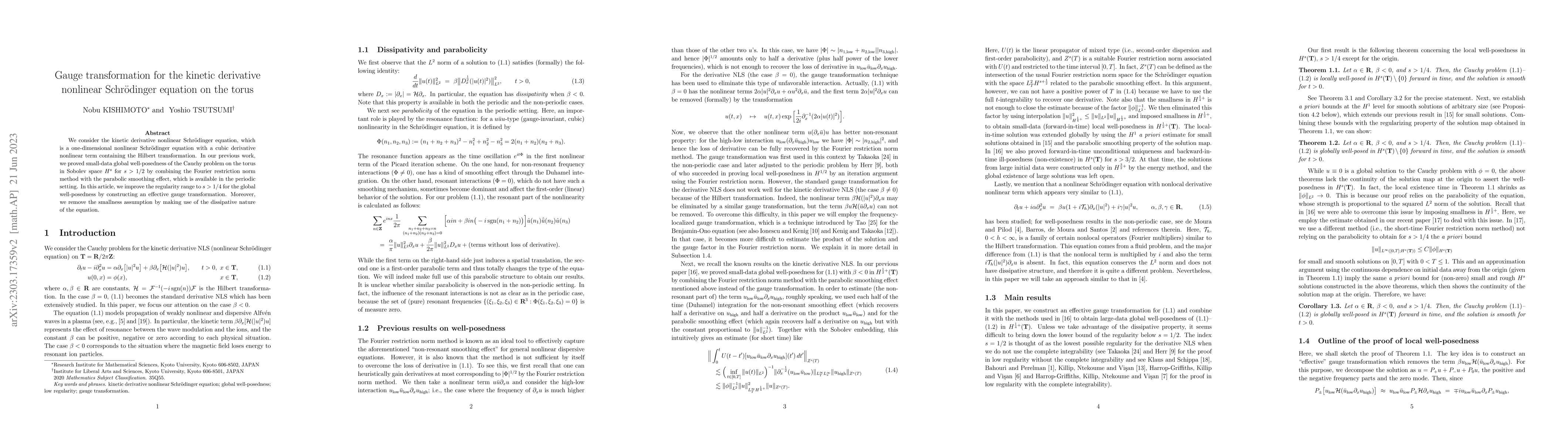 This paper improves the global well-posedness result for the kinetic derivative nonlinear Schrödinger equation on the torus, extending the regularity range from $s > 1/2$ to $s > 1/4$ using an effective gauge transformation. The authors also eliminate the small-data assumption by leveraging the equation's dissipative properties.