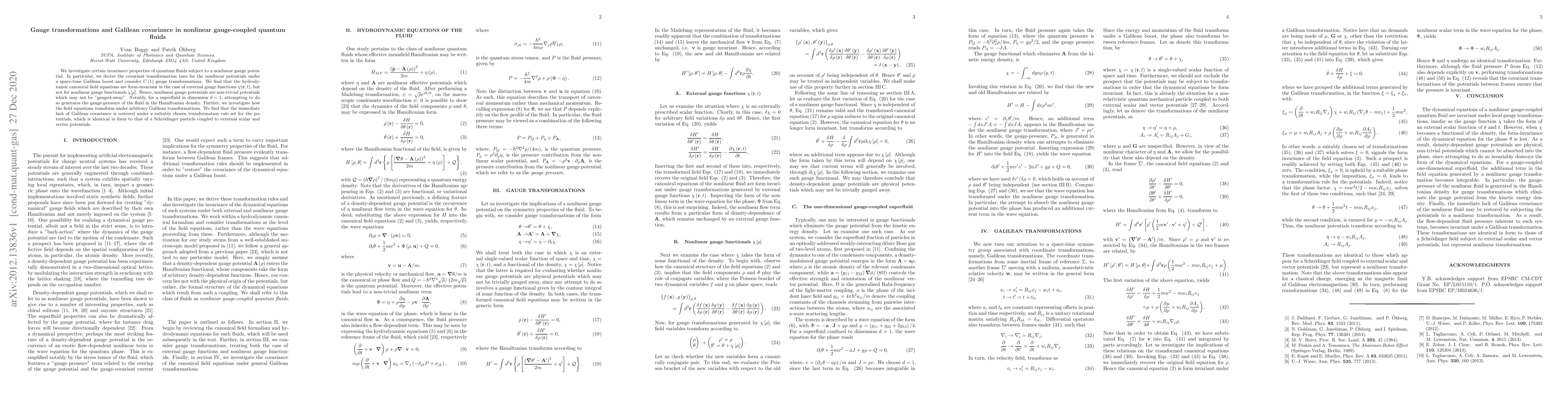 We investigate certain invariance properties of quantum fluids subject to a nonlinear gauge potential. In particular, we derive the covariant transformation laws for the nonlinear potentials under a space-time Galilean boost and consider U(1) gauge transformations. We find that the hydrodynamic canonical field equations are form-invariant in the case of external gauge functions, but not for nonlinear gauge functionals. Hence, nonlinear gauge potentials are non-trivial potentials which may not be "gauged-away". Notably, for a 1D superfluid, attempting to do so generates the gauge-pressure of the fluid in the Hamiltonian density. Further, we investigate how the field equations transform under arbitrary Galilean transformations. We find that the immediate lack of Galilean covariance is restored under a suitably chosen transformation rule set for the potentials, which is identical in form to that of a Schr\"odinger particle coupled to external scalar and vector potentials.