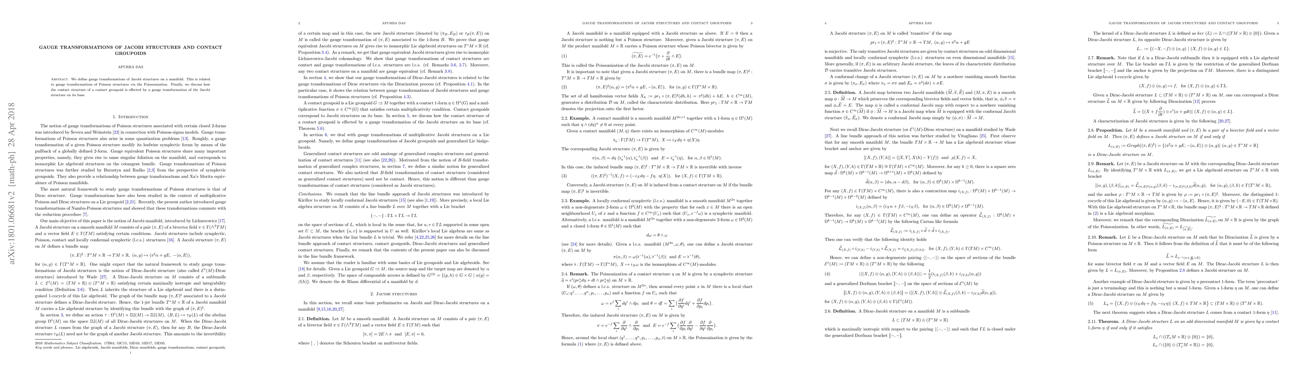 Summary: This paper defines gauge transformations for Jacobi structures on manifolds and connects them to Poisson structures via Poissonization. It also examines the impact of these transformations on the contact structure of contact groupoids based on the Jacobi structures.