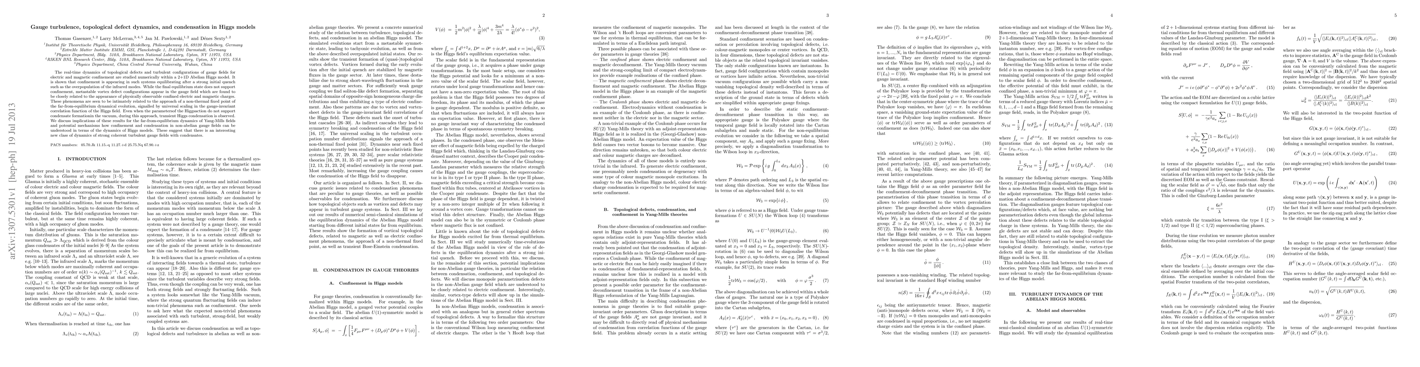 The real-time dynamics of topological defects and turbulent configurations of gauge fields for electric and magnetic confinement are studied numerically within a 2+1D Abelian Higgs model. It is shown that confinement is appearing in such systems equilibrating after a strong initial quench such as the overpopulation of the infrared modes. While the final equilibrium state does not support confinement, metastable vortex defect configurations appear in the gauge field which are found to be closely related to the appearance of physically observable confined electric and magnetic charges. These phenomena are seen to be intimately related to the approach of a non-thermal fixed point of the far-from-equilibrium dynamical evolution, signalled by universal scaling in the gauge-invariant correlation function of the Higgs field. Even when the parameters of the Higgs action do not support condensate formation in the vacuum, during this approach, transient Higgs condensation is observed. We discuss implications of these results for the far-from-equilibrium dynamics of Yang-Mills fields and potential mechanisms how confinement and condensation in non-abelian gauge fields can be understood in terms of the dynamics of Higgs models. These suggest that there is an interesting new class of dynamics of strong coherent turbulent gauge fields with condensates.
