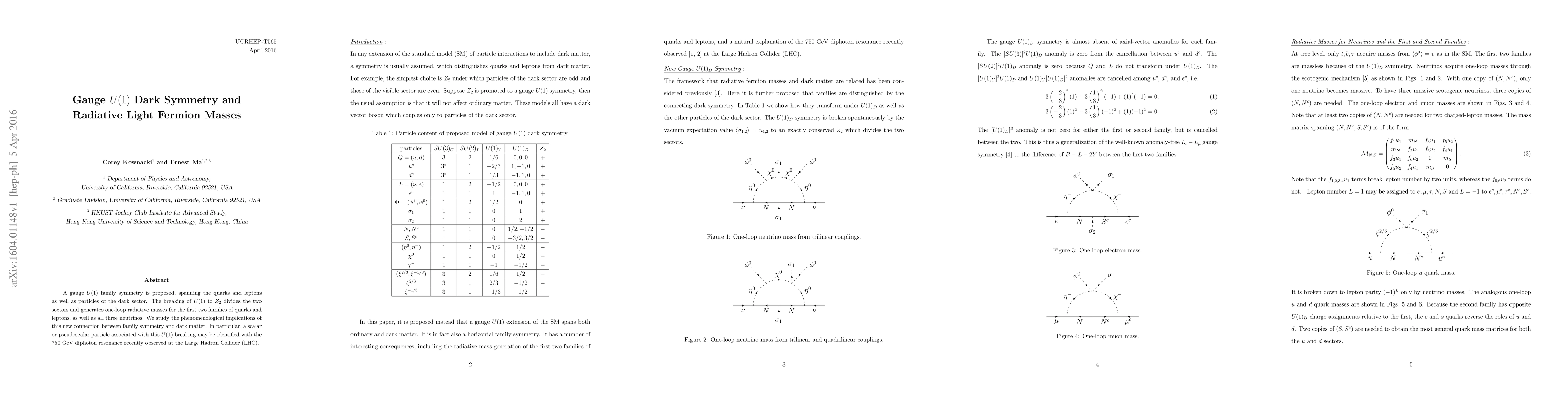This paper proposes a gauge $U(1)$ family symmetry linking quarks, leptons, and dark sector particles, with its breaking to $Z_2$ generating radiative masses for the first two families of quarks, leptons, and neutrinos. The study explores the phenomenological implications, including potential identification of a new scalar or pseudoscalar particle with the 750 GeV diphoton resonance observed at the LHC.