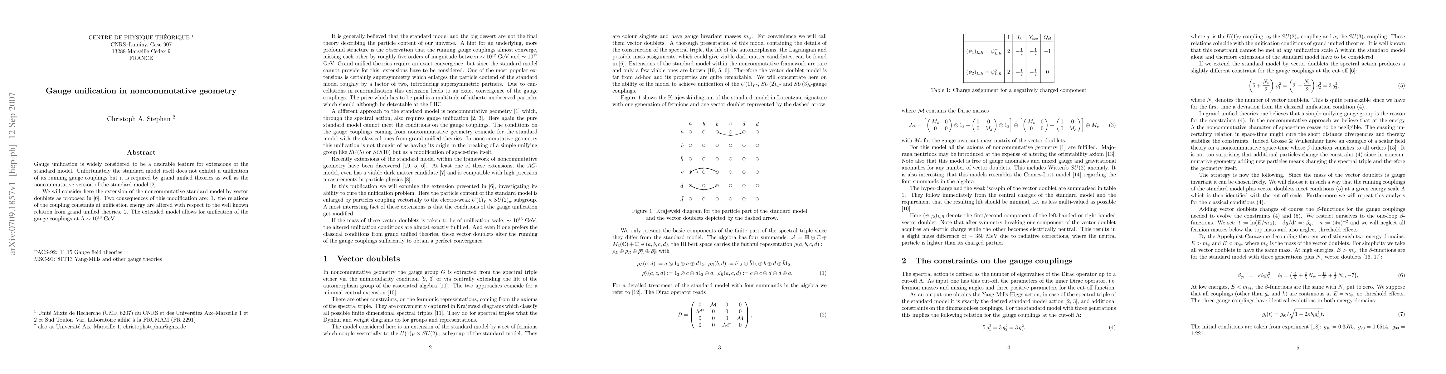 Gauge unification is widely considered to be a desirable feature for extensions of the standard model. Unfortunately the standard model itself does not exhibit a unification of its running gauge couplings but it is required by grand unified theories as well as the noncommutative version of the standard model [2]. We will consider here the extension of the noncommutative standard model by vector doublets as proposed in [6]. Two consequences of this modification are: 1. the relations of the coupling constants at unification energy are altered with respect to the well known relation from grand unified theories. 2. The extended model allows for unification of the gauge couplings at ~10^(13) GeV.