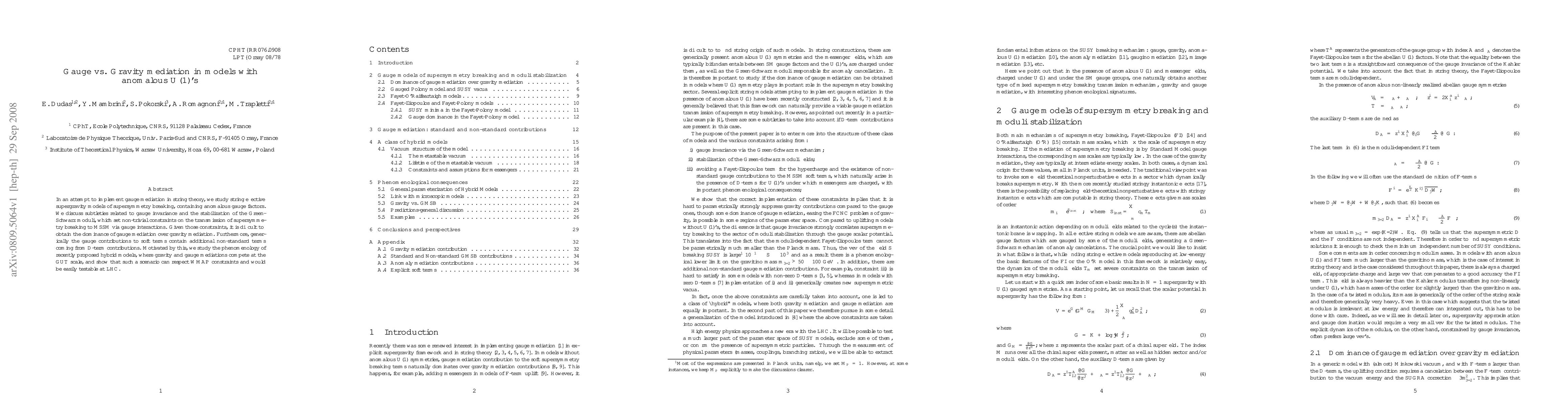 This paper explores gauge mediation in string theory with anomalous U(1) gauge factors, highlighting challenges in transmitting supersymmetry breaking and difficulties in achieving dominance over gravity mediation. It examines hybrid models where both gauge and gravity mediation compete, demonstrating their potential to satisfy cosmological constraints and be testable at the LHC.