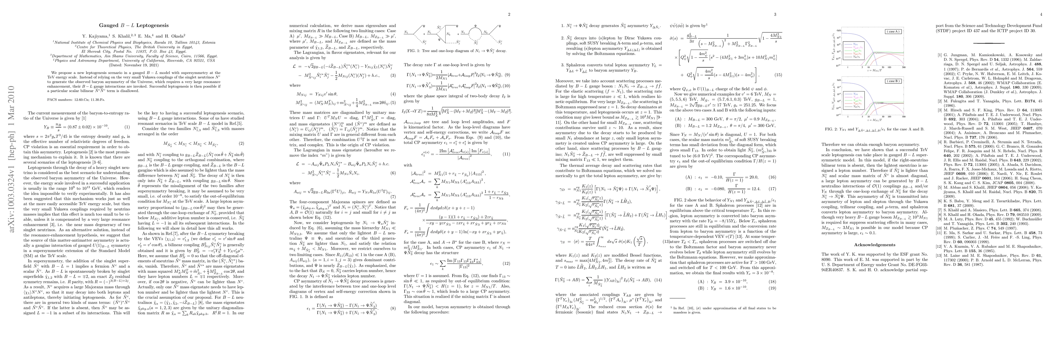We propose a new leptogenesis scenario in a gauged $B-L$ model with supersymmetry at the TeV energy scale. Instead of relying on the very small Yukawa couplings of the singlet neutrinos $N^c$ to generate the observed baryon asymmetry of the Universe, which requires a very large resonance enhancement, their $B-L$ gauge interactions are invoked. Successful leptogenesis is then possible if a particular scalar bilinear $\tilde N^c \tilde N^c$ term is disallowed.