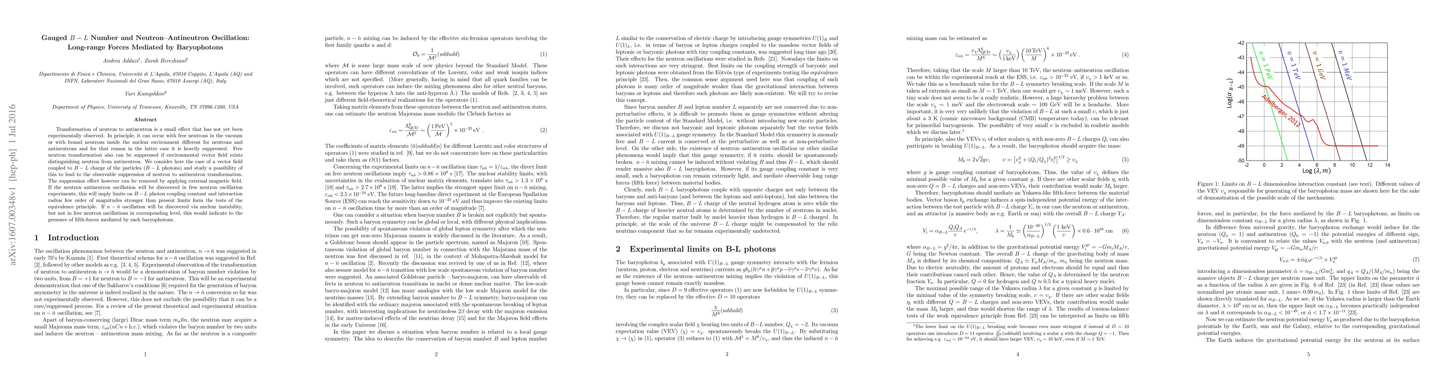 Transformation of neutron to antineutron is a small effect that has not yet been experimentally observed. %\cite{Phillips:2014fgb}. In principle, it can occur with free neutrons in the vacuum or with bound neutrons inside the nuclear environment different for neutrons and antineutrons and for that reason in the latter case it is heavily suppressed. Free neutron transformation also can be suppressed if environmental vector field exists destinguishing neutron from antineutron. We consider here the case of a vector field coupled to $B-L$ charge of the particles ($B-L$ photons) and study a possibility of this to lead to the observable suppression of neutron to antineutron transformation. The suppression effect however can be removed by applying external magnetic field. If the neutron--antineutron oscillation will be discovered in free neutron oscillation experiments, this will imply limits on $B-L$ photon coupling constant and interaction radius few order of magnitudes stronger than present limits form the tests of the equivalence principle. If $n-\bar n$ oscillation will be discovered via nuclear instability, but not in free neutron oscillations in corresponding level, this would indicate to the presence of fifth-forces mediated by such baryophotons.
