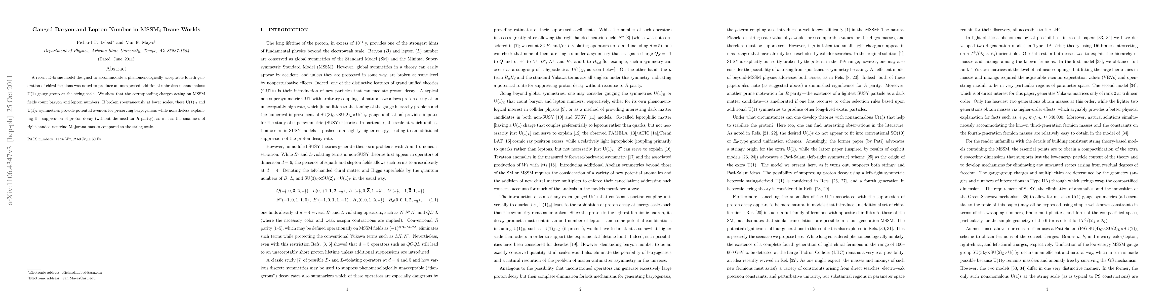 This paper explores a D-brane model in MSSM_4 brane worlds that introduces an unexpected gauged U(1) symmetry associated with baryon and lepton numbers. If this symmetry is spontaneously broken at lower scales, it could preserve baryogenesis, explain the suppression of proton decay, and account for the smallness of right-handed neutrino Majorana masses.