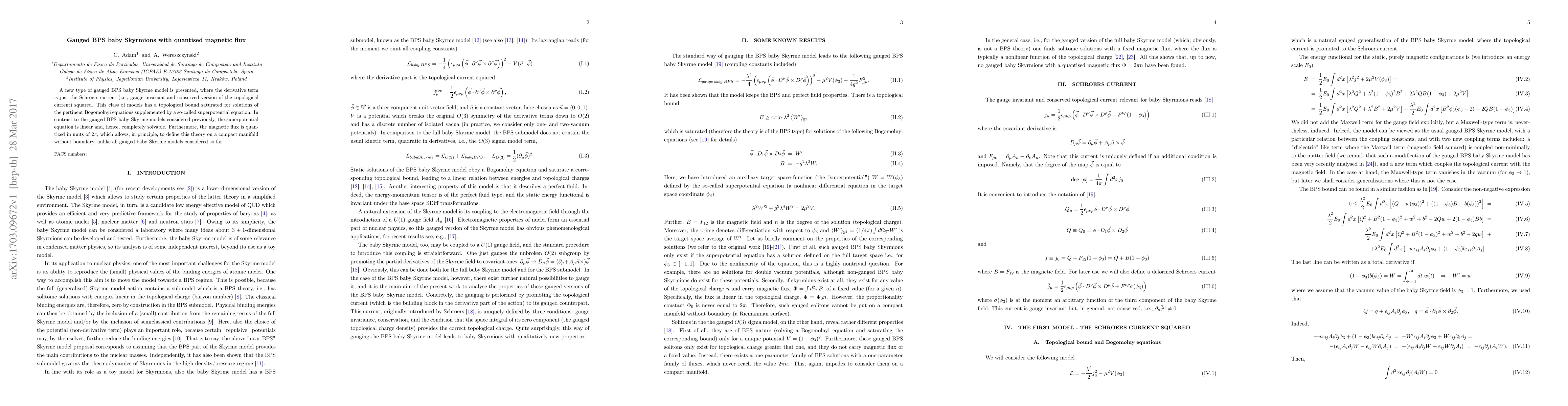 This paper introduces a novel gauged BPS baby Skyrme model featuring a squared Schroers current term, which allows for a topological bound and linear, solvable superpotential equation. The model exhibits quantized magnetic flux in units of $2\pi$, enabling its definition on compact manifolds without boundaries.