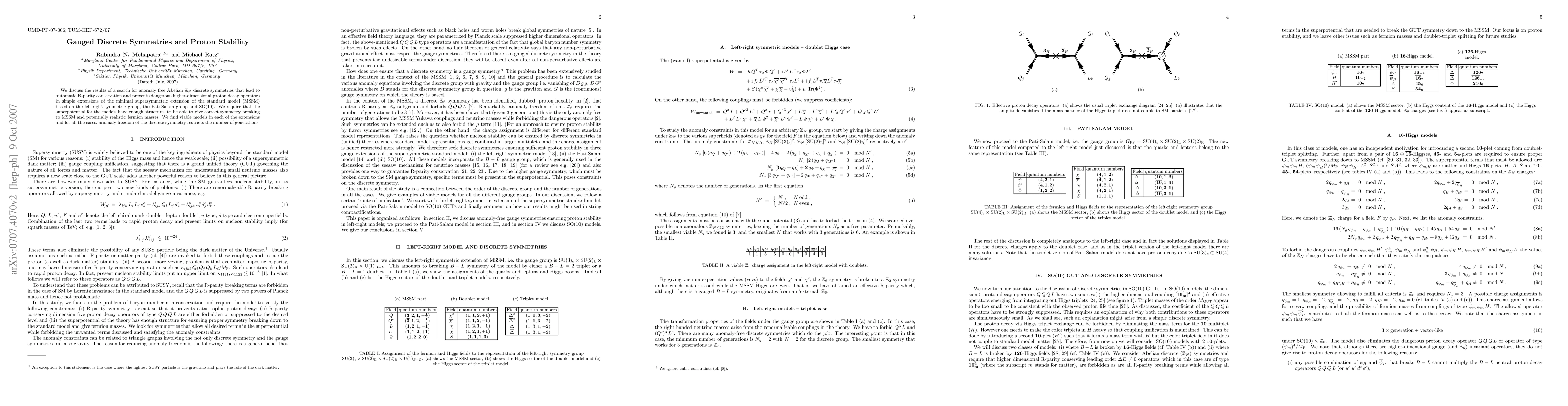 This paper explores Abelian Z_N discrete symmetries in extensions of the MSSM that ensure proton stability by preventing higher-dimensional decay operators. It finds viable models in left-right, Pati-Salam, and SO(10) frameworks, with anomaly-free symmetries limiting the number of generations.
