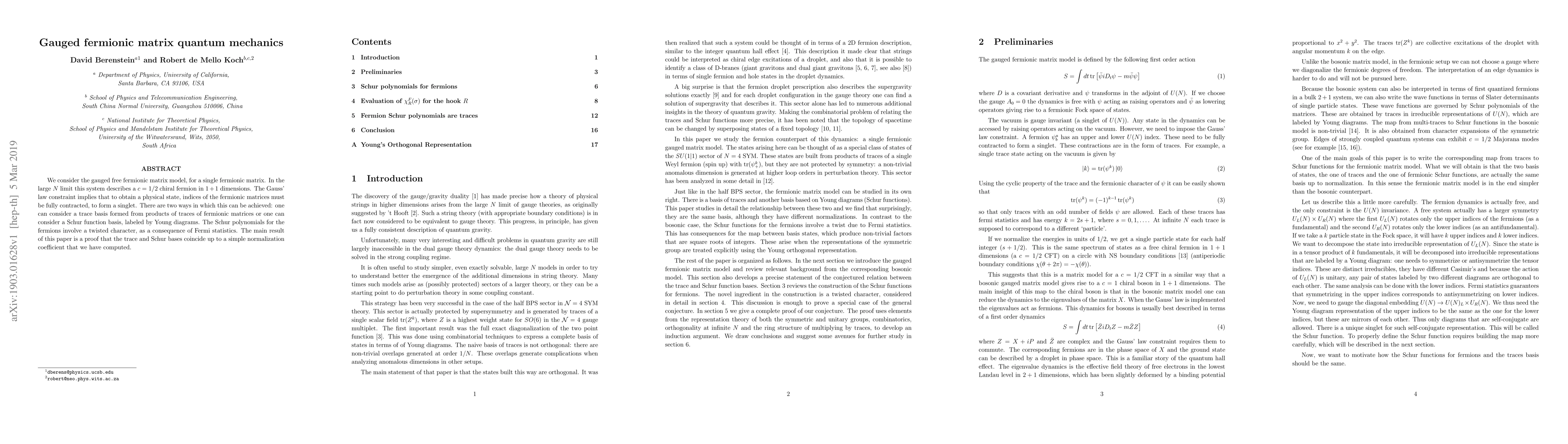We consider the gauged free fermionic matrix model, for a single fermionic matrix. In the large $N$ limit this system describes a $c=1/2$ chiral fermion in $1+1$ dimensions. The Gauss' law constraint implies that to obtain a physical state, indices of the fermionic matrices must be fully contracted, to form a singlet. There are two ways in which this can be achieved: one can consider a trace basis formed from products of traces of fermionic matrices or one can consider a Schur function basis, labeled by Young diagrams. The Schur polynomials for the fermions involve a twisted character, as a consequence of Fermi statistics. The main result of this paper is a proof that the trace and Schur bases coincide up to a simple normalization coefficient that we have computed.