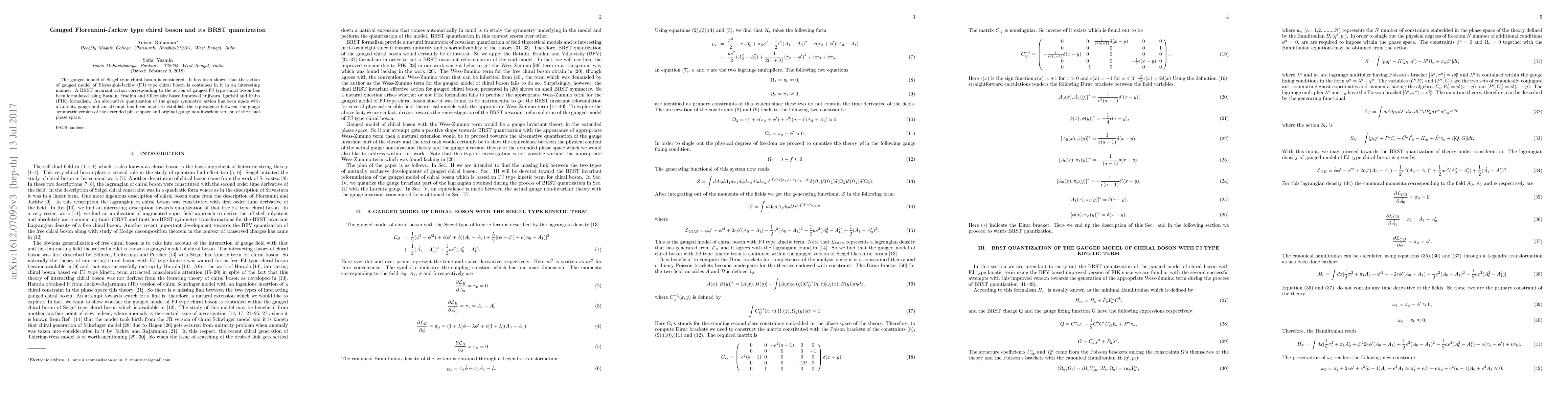The gauged model of Siegel type chiral boson is considered. It has been shown that the action of gauged model of Floreanini-Jackiw (FJ) type chiral boson is contained in it in an interesting manner. A BRST invariant action corresponding to the action of gauged FJ type chiral boson has been formulated using Batalin, Fradkin and Vilkovisky based improved Fujiwara, Igarishi and Kubo (FIK) formalism. An alternative quantization of the gauge symmetric action has been made with a Lorentz gauge and an attempt has been made to establish the equivalence between the gauge symmetric version of the extended phase space and original gauge non-invariant version of the usual phase space.