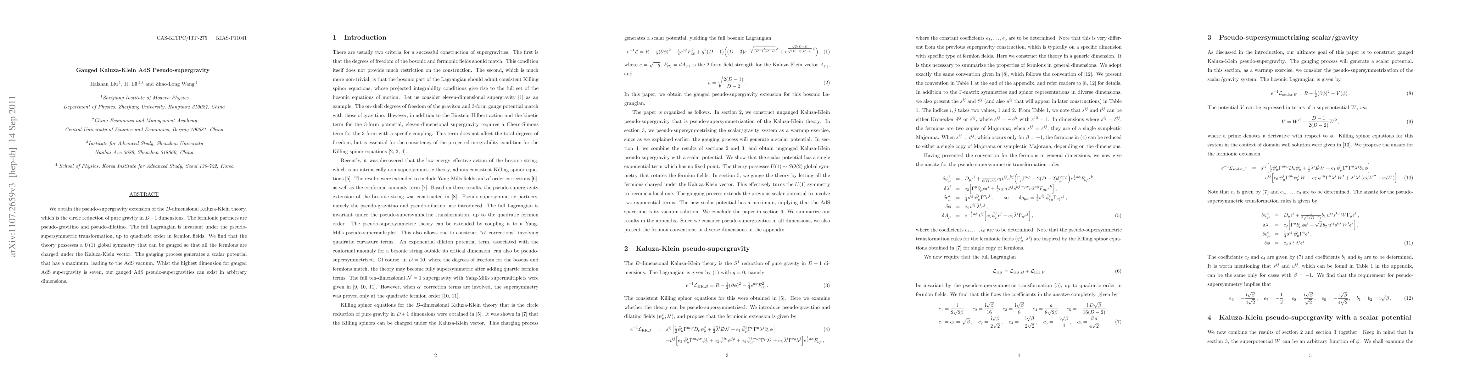 This research extends the Kaluza-Klein theory into pseudo-supergravity, introducing fermionic partners and a U(1) global symmetry that can be gauged. The gauging generates a scalar potential leading to an AdS vacuum, with the pseudo-supergravity existing in any dimension.