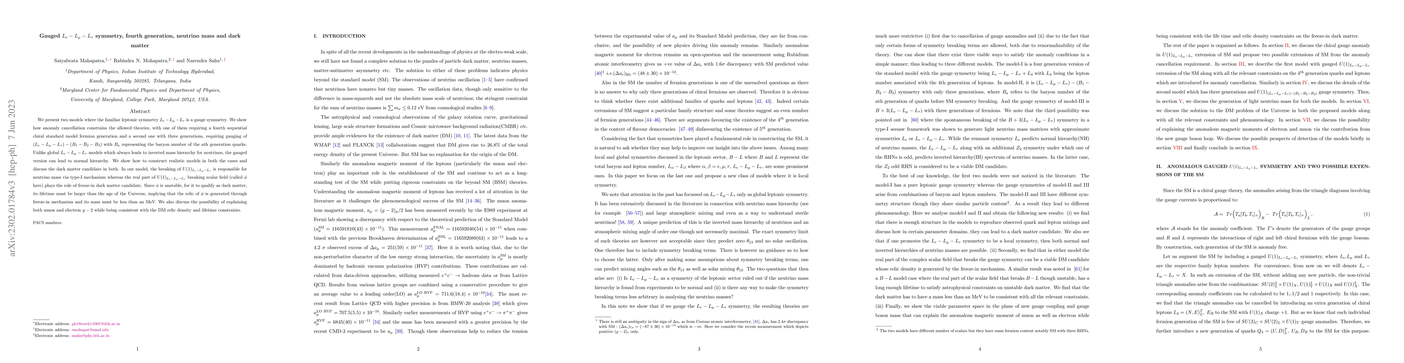 This paper proposes two gauged $L_e-L_\mu-L_\tau$ symmetry models, one with a fourth fermion generation and one with three generations. It explores how these models can lead to a normal neutrino mass hierarchy and introduces a freeze-in dark matter candidate from the breaking of the gauge symmetry.