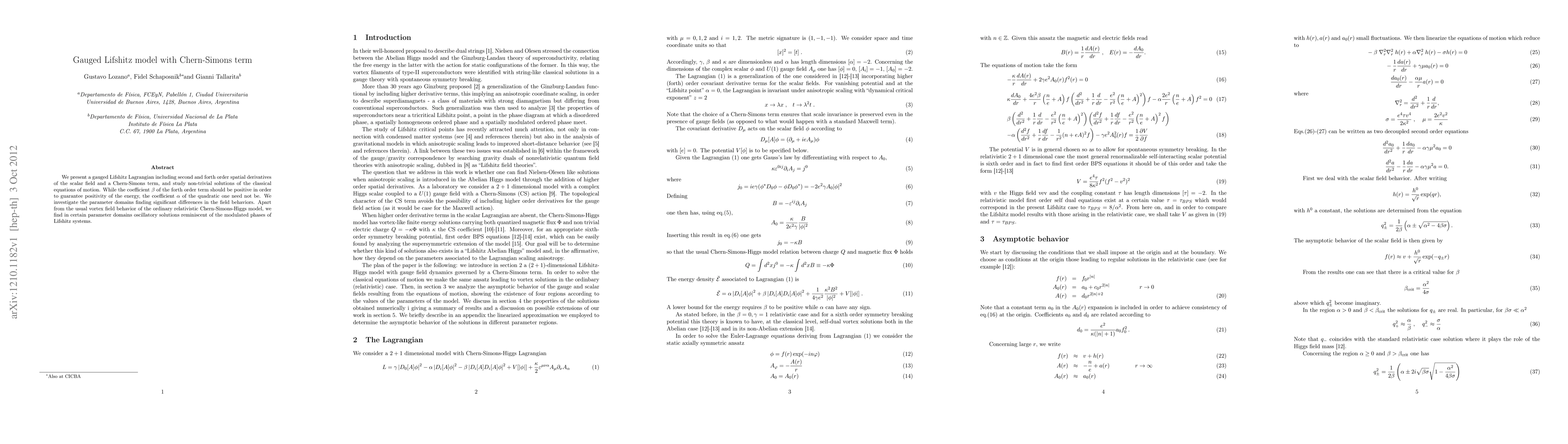 We present a gauged Lifshitz Lagrangian including second and forth order spatial derivatives of the scalar field and a Chern-Simons term, and study non-trivial solutions of the classical equations of motion. While the coefficient beta of the forth order term should be positive in order to guarantee positivity of the energy, the coefficient alpha of the quadratic one need not be. We investigate the parameter domains finding significant differences in the field behaviors. Apart from the usual vortex field behavior of the ordinary relativistic Chern-Simons-Higgs model, we find in certain parameter domains oscillatory solutions reminiscent of the modulated phases of Lifshitz systems.