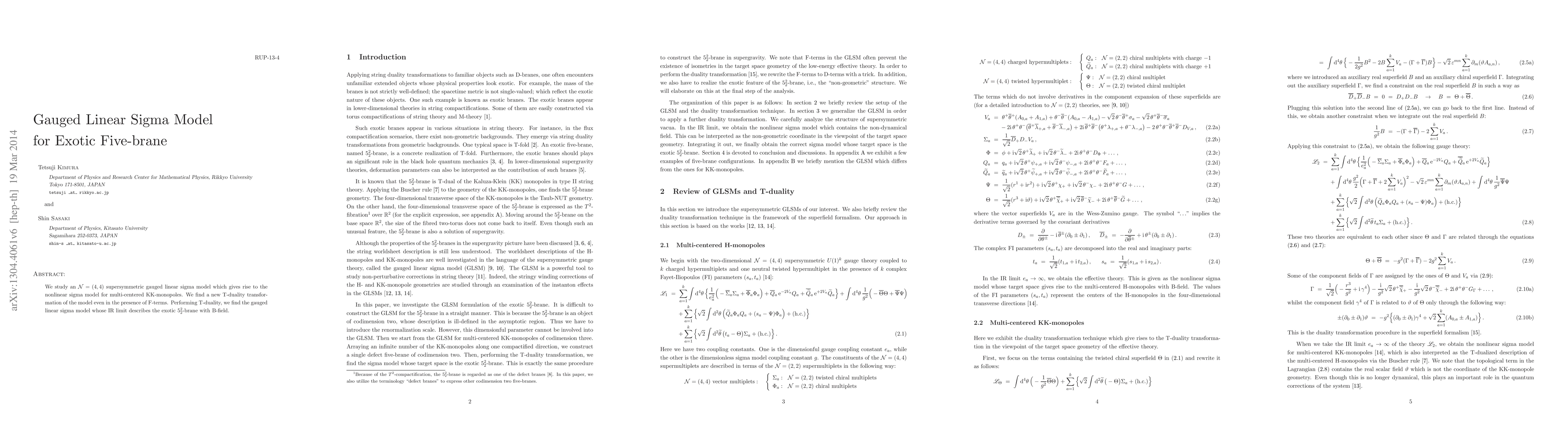 The research explores an N=(4,4) supersymmetric gauged linear sigma model that leads to a nonlinear sigma model for multi-centered KK-monopoles, revealing a novel T-duality transformation in the presence of F-terms, which describes an exotic 522-brane with a B-field in its infrared limit.