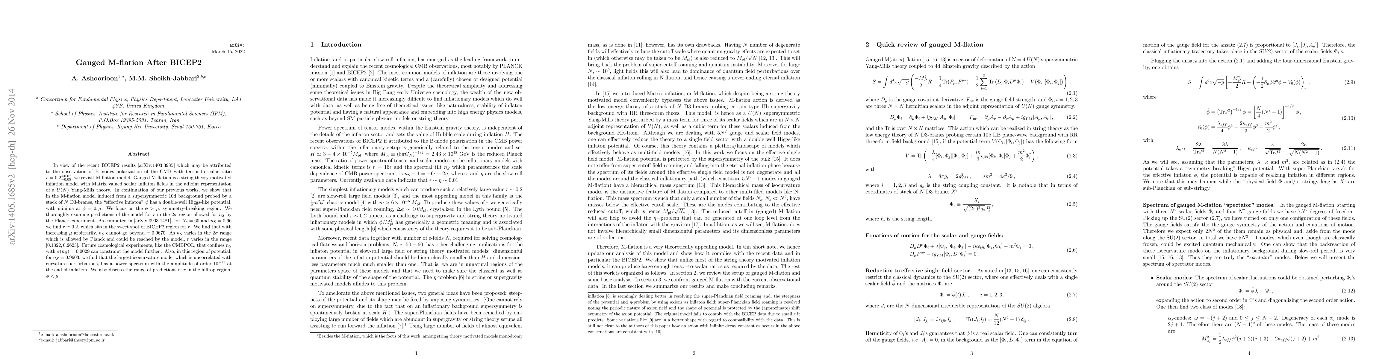 This paper revisits the Gauged M-flation model in light of BICEP2's results, showing it can predict a tensor-to-scalar ratio $r$ around 0.2, fitting within the BICEP2 observations. The model's potential allows for a range of $r$ values while maintaining $n_S$ within the Planck-allowed $2\sigma$ range.