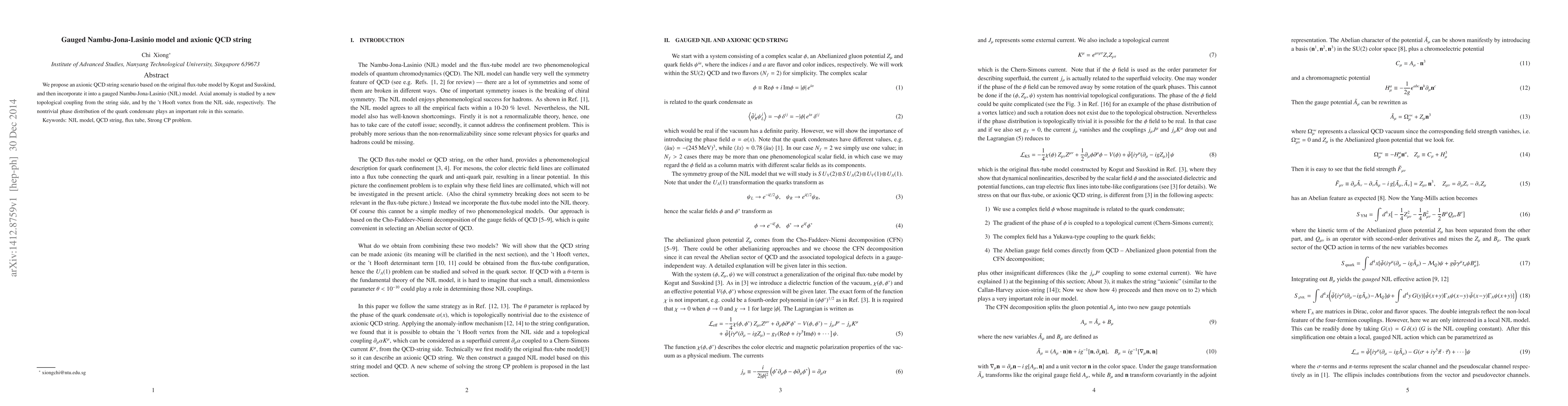 We propose an axionic QCD string scenario based on the original flux-tube model by Kogut and Susskind, and then incorporate it into a gauged Nambu-Jona-Lasinio (NJL) model. Axial anomaly is studied by a new topological coupling from the string side, and by the 't Hooft vortex from the NJL side, respectively. The nontrivial phase distribution of the quark condensate plays an important role in this scenario.