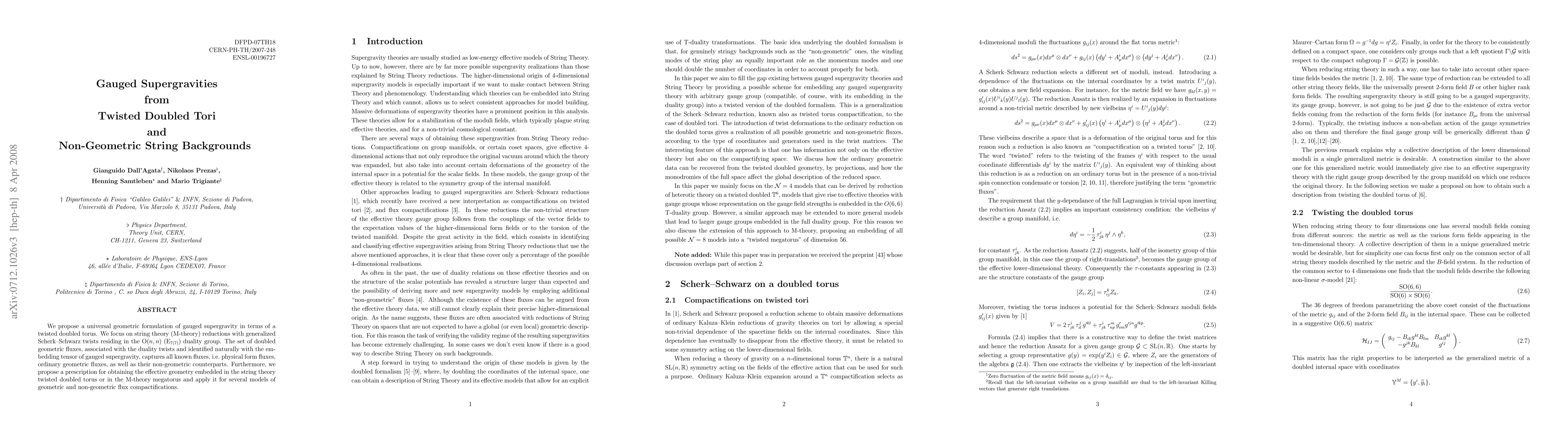 We propose a universal geometric formulation of gauged supergravity in terms of a twisted doubled torus. We focus on string theory (M-theory) reductions with generalized Scherk-Schwarz twists residing in the O(n,n) (E_{7(7)}) duality group. The set of doubled geometric fluxes, associated with the duality twists and identified naturally with the embedding tensor of gauged supergravity, captures all known fluxes, i.e. physical form fluxes, ordinary geometric fluxes, as well as their non-geometric counterparts. Furthermore, we propose a prescription for obtaining the effective geometry embedded in the string theory twisted doubled torus or in the M-theory megatorus and apply it for several models of geometric and non-geometric flux compactifications.