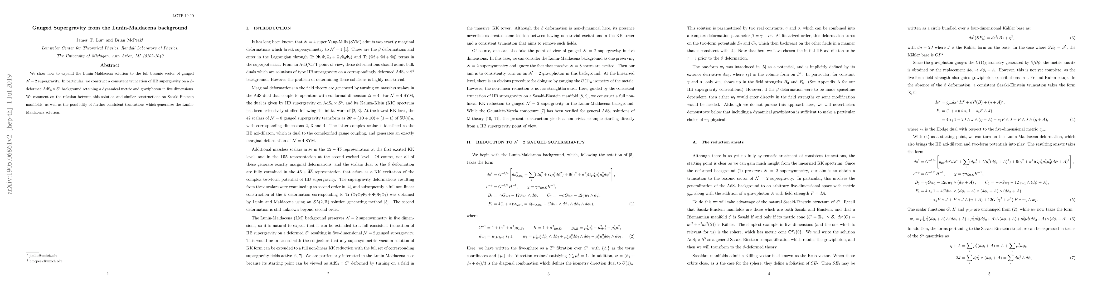 We show how to expand the Lunin-Maldacena solution to the full bosonic sector of gauged $\mathcal N=2$ supergravity. In particular, we construct a consistent truncation of IIB supergravity on a $\beta$-deformed $\mathrm{AdS}_5\times S^5$ background retaining a dynamical metric and graviphoton in five dimensions. We comment on the relation between this solution and similar constructions on Sasaki-Einstein manifolds, as well as the possibility of further consistent truncations which generalize the Lunin-Maldacena solution.