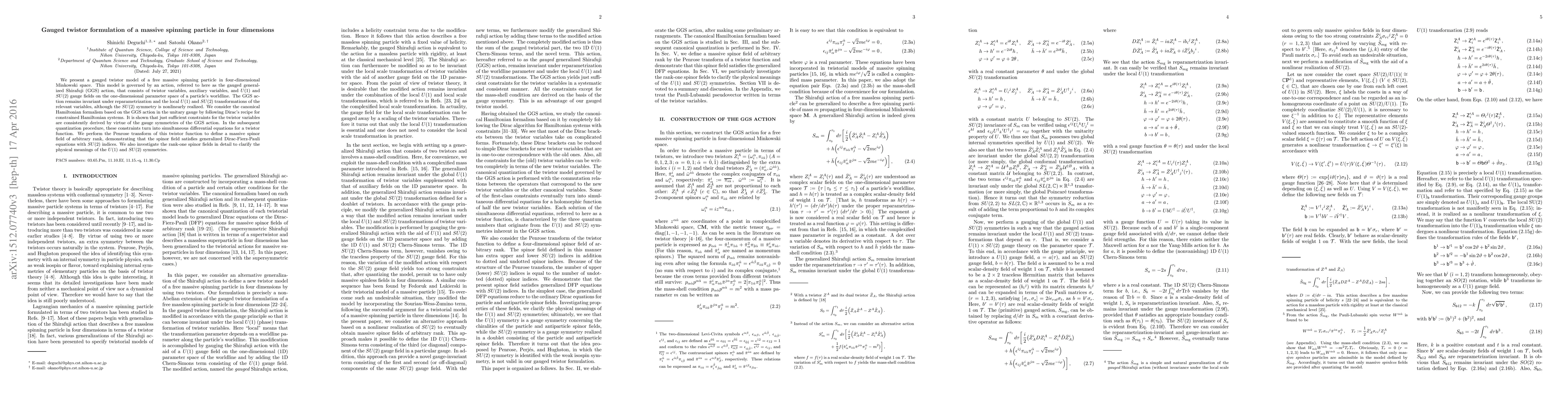This paper introduces a gauged twistor model for a free massive spinning particle in four dimensions using the gauged generalized Shirafuji (GGS) action. It demonstrates how the GGS action's symmetries lead to derived constraints and ultimately defines a massive spinor field satisfying generalized Dirac-Fierz-Pauli equations.