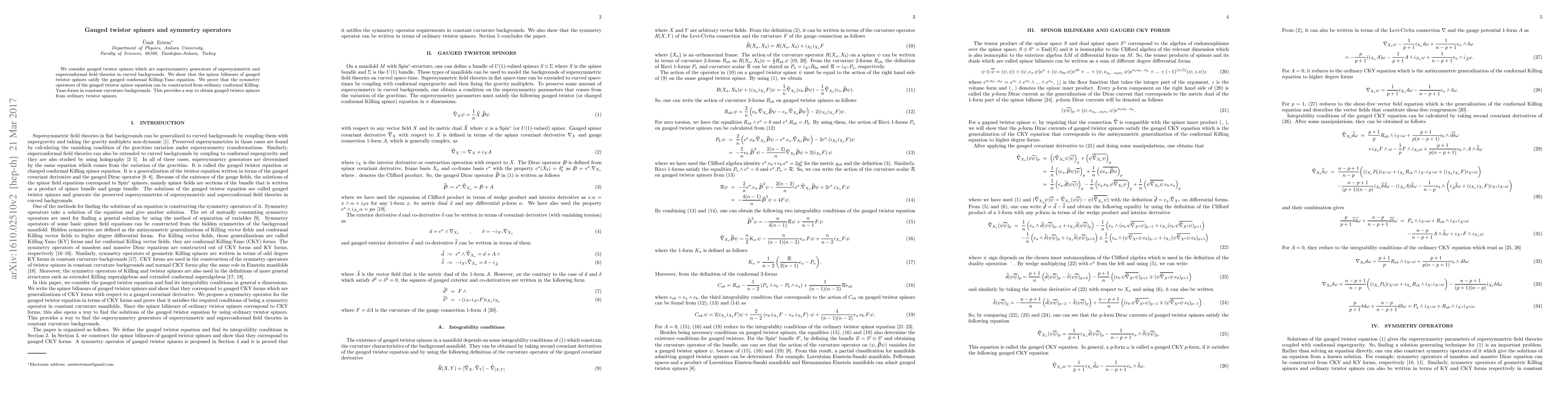 This paper explores gauged twistor spinors as supersymmetry generators in curved backgrounds, demonstrating their spinor bilinears satisfy the gauged conformal Killing-Yano equation. It also proves that symmetry operators for these spinors can be derived from conformal Killing-Yano forms in constant curvature settings, offering a method to transition from ordinary to gauged twistor spinors.