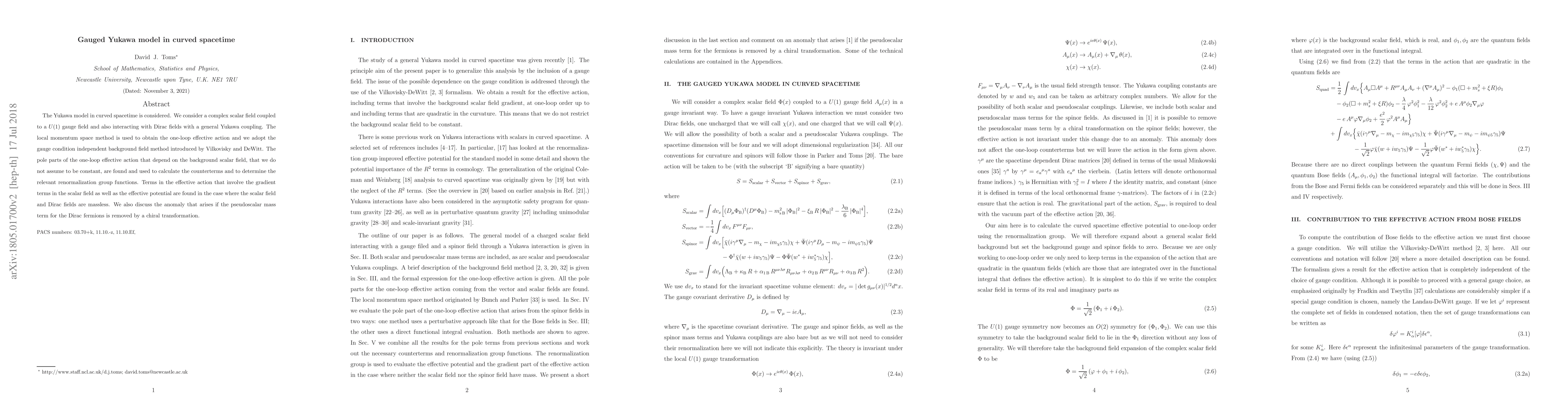 This paper explores a gauged Yukawa model in curved spacetime, employing a complex scalar field coupled to a $U(1)$ gauge field and interacting with Dirac fields via a general Yukawa coupling. The study calculates the one-loop effective action and relevant renormalization group functions, addressing the effective potential and anomaly issues arising from chiral transformations.