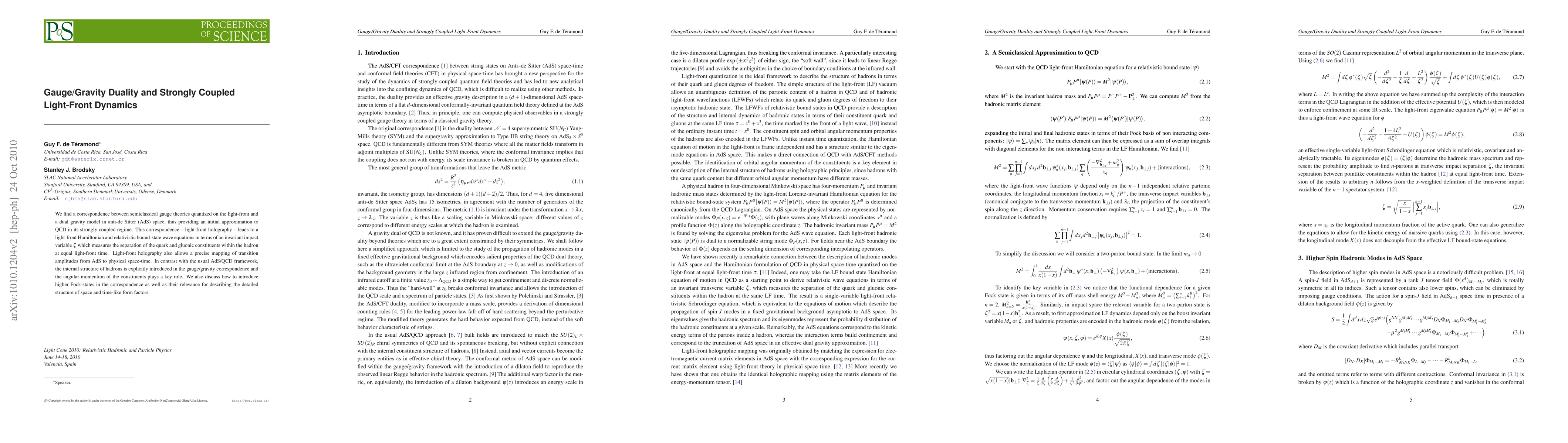 This paper establishes a correspondence between semiclassical gauge theories on the light-front and a dual gravity model in anti-de Sitter (AdS) space, termed light-front holography, which provides insights into QCD's strongly coupled regime. This framework introduces the internal structure of hadrons and the angular momentum of constituents explicitly, offering a precise mapping of transition amplitudes and relevance for higher Fock-states and form factors.