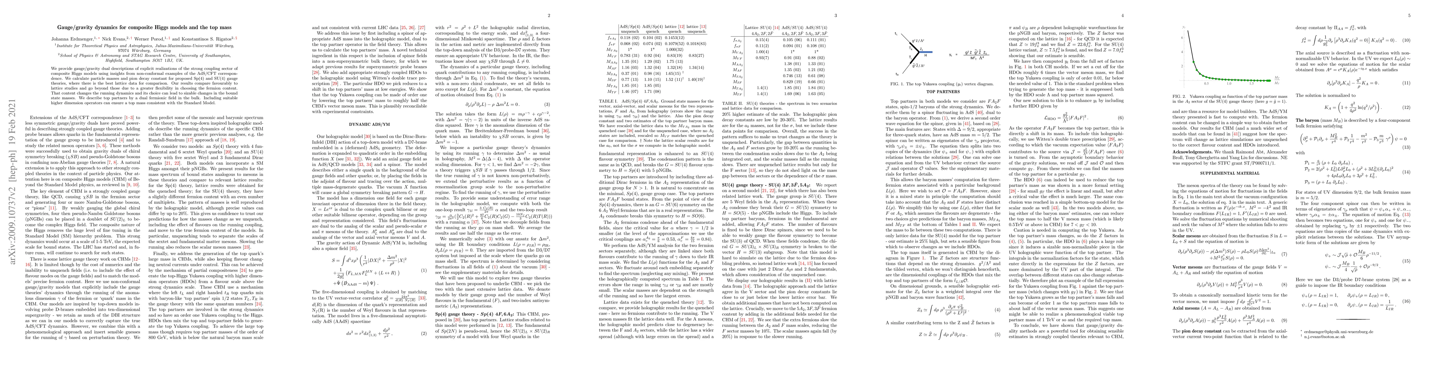 This research uses gauge/gravity duality to describe strong coupling sectors in composite Higgs models, calculating masses and decay constants for Sp(4) and SU(4) theories. Results align with lattice studies and demonstrate that fermion content selection significantly impacts bound state masses, enabling top partner description via a dual fermionic field in the bulk. Including higher dimension operators ensures a top mass consistent with the Standard Model.