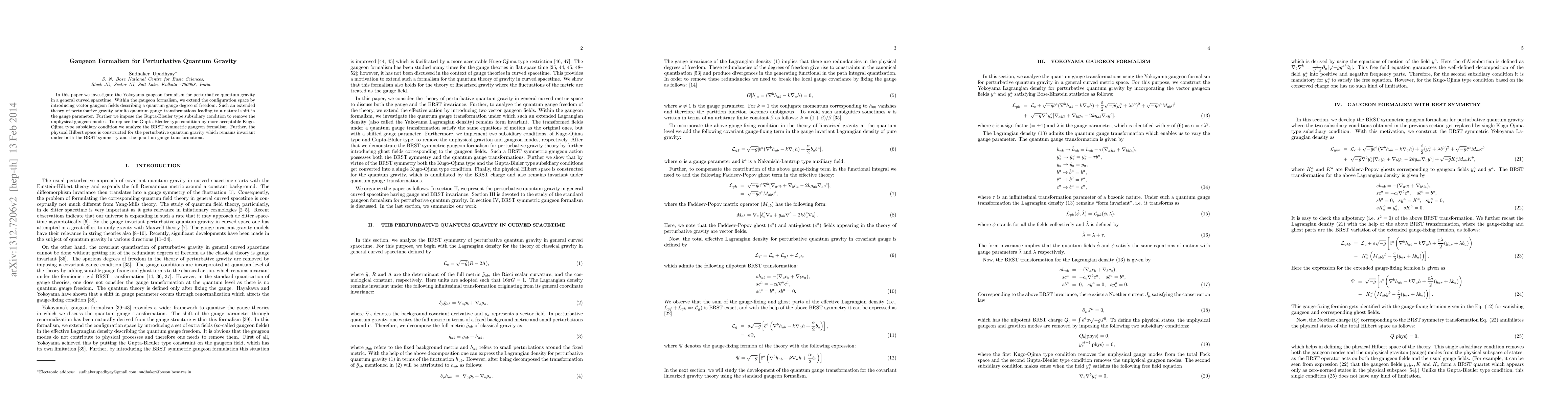This paper explores the Yokoyama gaugeon formalism for perturbative quantum gravity in curved spacetime, introducing gaugeon fields to manage quantum gauge degrees of freedom. It constructs a physical Hilbert space invariant under BRST symmetry and quantum gauge transformations, ultimately replacing the Gupta-Bleuler condition with the Kugo-Ojima subsidiary condition.
