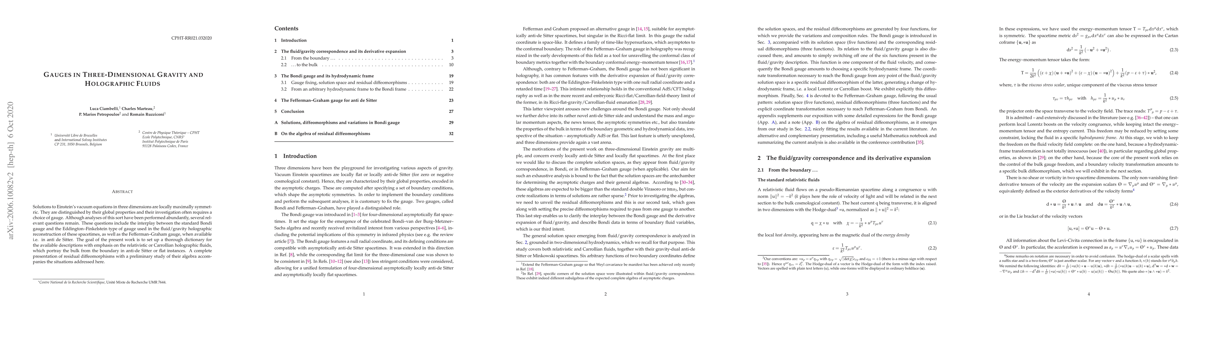 Solutions to Einstein's vacuum equations in three dimensions are locally maximally symmetric. They are distinguished by their global properties and their investigation often requires a choice of gauge. Although analyses of this sort have been performed abundantly, several relevant questions remain. These questions include the interplay between the standard Bondi gauge and the Eddington--Finkelstein type of gauge used in the fluid/gravity holographic reconstruction of these spacetimes, as well as the Fefferman--Graham gauge, when available i.e. in anti de Sitter. The goal of the present work is to set up a thorough dictionary for the available descriptions with emphasis on the relativistic or Carrollian holographic fluids, which portray the bulk from the boundary in anti-de Sitter or flat instances. A complete presentation of residual diffeomorphisms with a preliminary study of their algebra accompanies the situations addressed here.