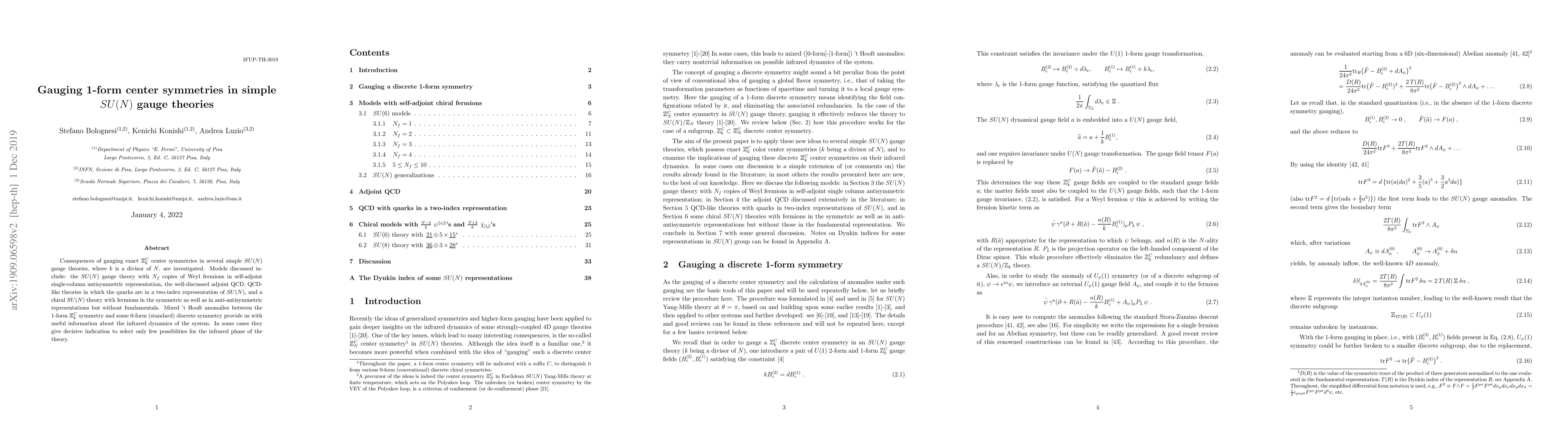 This paper investigates the impact of gauging exact $Z_k^C$ center symmetries in various simple $SU(N)$ gauge theories. It focuses on models like $SU(N)$ gauge theories with Weyl fermions and adjoint QCD, and examines mixed 't Hooft anomalies to understand the infrared dynamics and phase possibilities of these theories.