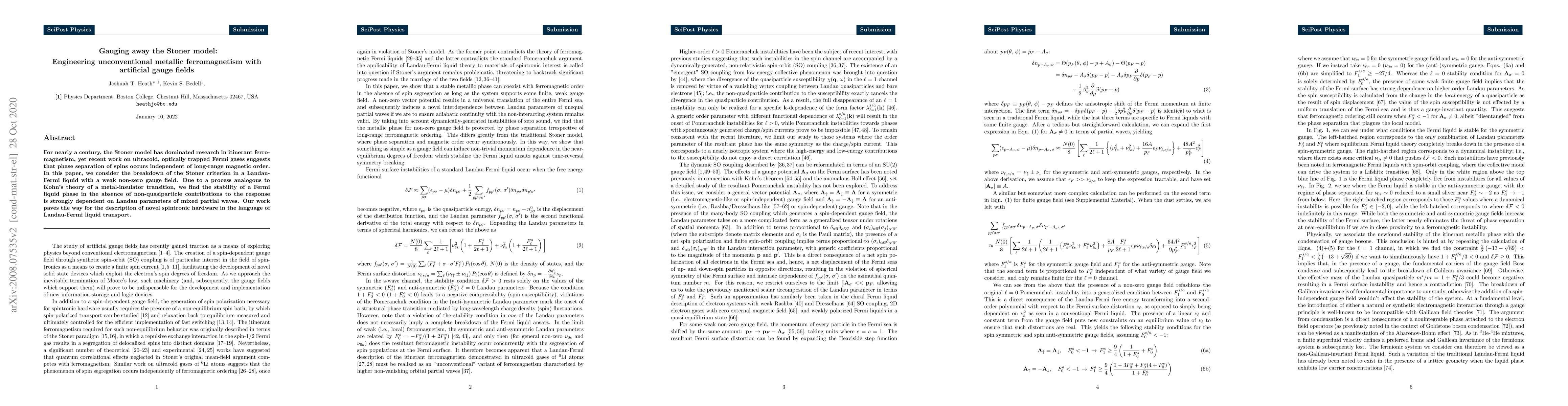 For nearly a century, the Stoner model has dominated research in itinerant ferromagnetism, yet recent work on ultracold, optically trapped Fermi gases suggests that phase separation of spins occurs independent of long-range magnetic order. In this paper, we consider the breakdown of the Stoner criterion in a Landau-Fermi liquid with weak non-zero gauge field. Due to a process analogous to Kohn's theory of a metal-insulator transition, we find the stability of a Fermi liquid phase in the absence of non-quasiparticle contributions to the response is strongly dependent on Landau parameters of mixed partial waves. Our work paves the way for the description of novel spintronic hardware in the language of Landau-Fermi liquid transport.