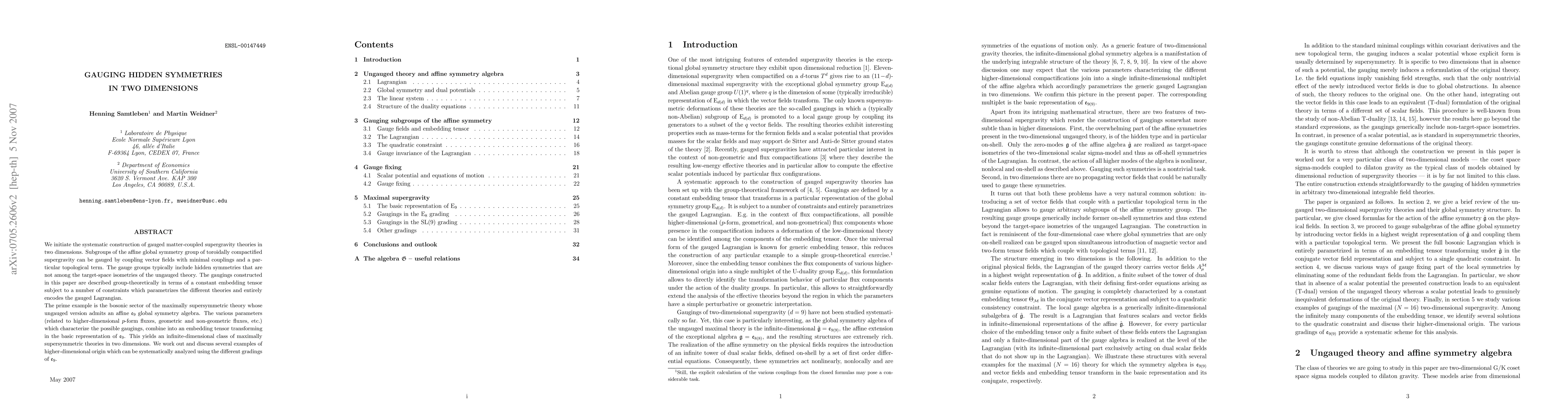 This paper constructs gauged supergravity theories in two dimensions, focusing on gauging hidden symmetries through vector fields and a topological term. It introduces an embedding tensor that encodes the gauged Lagrangian and explores the bosonic sector of maximally supersymmetric theories, revealing an infinite-dimensional class of such theories.