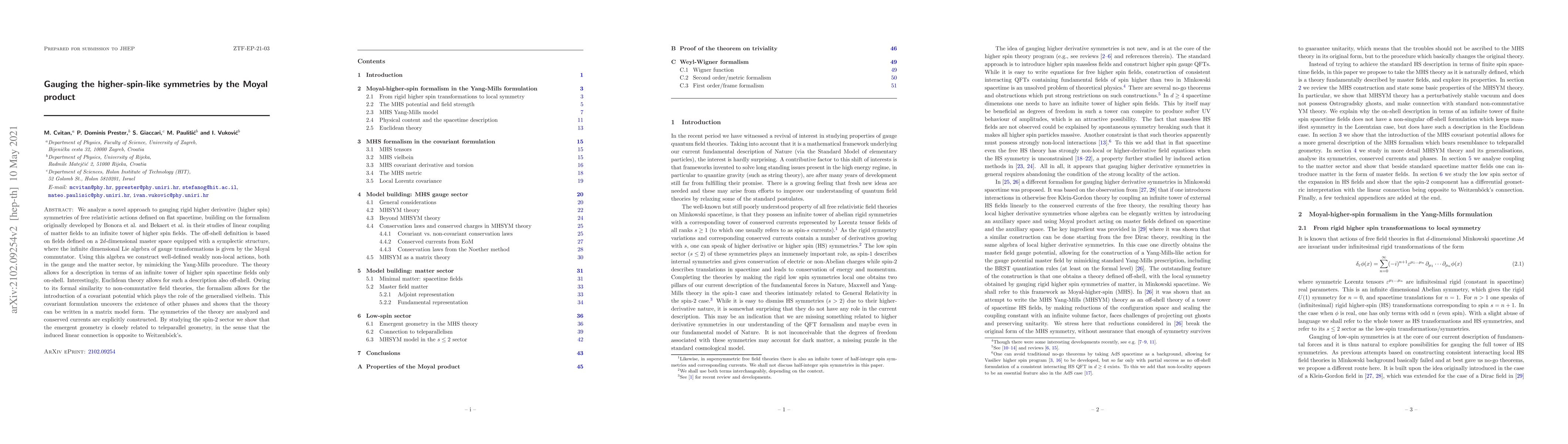 We analyze a novel approach to gauging rigid higher derivative (higher spin) symmetries of free relativistic actions defined on flat spacetime, building on the formalism originally developed by Bonora et al. and Bekaert et al. in their studies of linear coupling of matter fields to an infinite tower of higher spin fields. The off-shell definition is based on fields defined on a $2d$-dimensional master space equipped with a symplectic structure, where the infinite dimensional Lie algebra of gauge transformations is given by the Moyal commutator. Using this algebra we construct well-defined weakly non-local actions, both in the gauge and the matter sector, by mimicking the Yang-Mills procedure. The theory allows for a description in terms of an infinite tower of higher spin spacetime fields only on-shell. Interestingly, Euclidean theory allows for such a description also off-shell. Owing to its formal similarity to non-commutative field theories, the formalism allows for the introduction of a covariant potential which plays the role of the generalised vielbein. This covariant formulation uncovers the existence of other phases and shows that the theory can be written in a matrix model form. The symmetries of the theory are analyzed and conserved currents are explicitly constructed. By studying the spin-2 sector we show that the emergent geometry is closely related to teleparallel geometry, in the sense that the induced linear connection is opposite to Weitzenb\"{o}ck's.