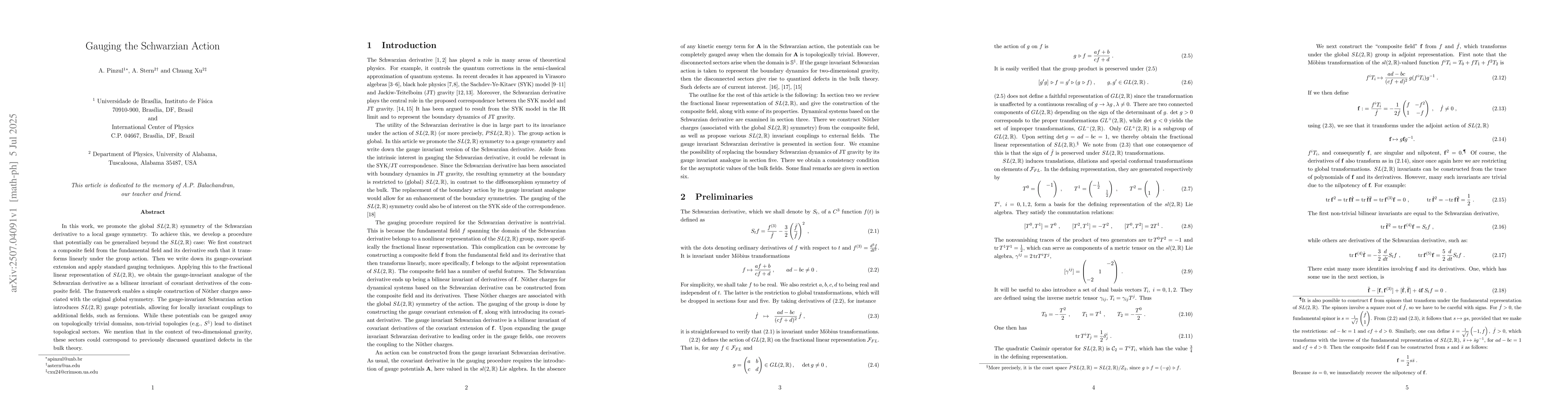 In this work, we promote the global $SL(2,\mathbb{R})$ symmetry of the Schwarzian derivative to a local gauge symmetry. To achieve this, we develop a procedure that potentially can be generalized beyond the $SL(2,\mathbb{R})$ case: We first construct a composite field from the fundamental field and its derivative such that it transforms linearly under the group action. Then we write down its gauge-covariant extension and apply standard gauging techniques. Applying this to the fractional linear representation of $SL(2,\mathbb{R})$, we obtain the gauge-invariant analogue of the Schwarzian derivative as a bilinear invariant of covariant derivatives of the composite field. The framework enables a simple construction of N\"other charges associated with the original global symmetry. The gauge-invariant Schwarzian action introduces $SL(2,\mathbb{R})$ gauge potentials, allowing for locally invariant couplings to additional fields, such as fermions. While these potentials can be gauged away on topologically trivial domains, non-trivial topologies (e.g., $S^1$) lead to distinct topological sectors. We mention that in the context of two-dimensional gravity, these sectors could correspond to previously discussed defects in the bulk theory.