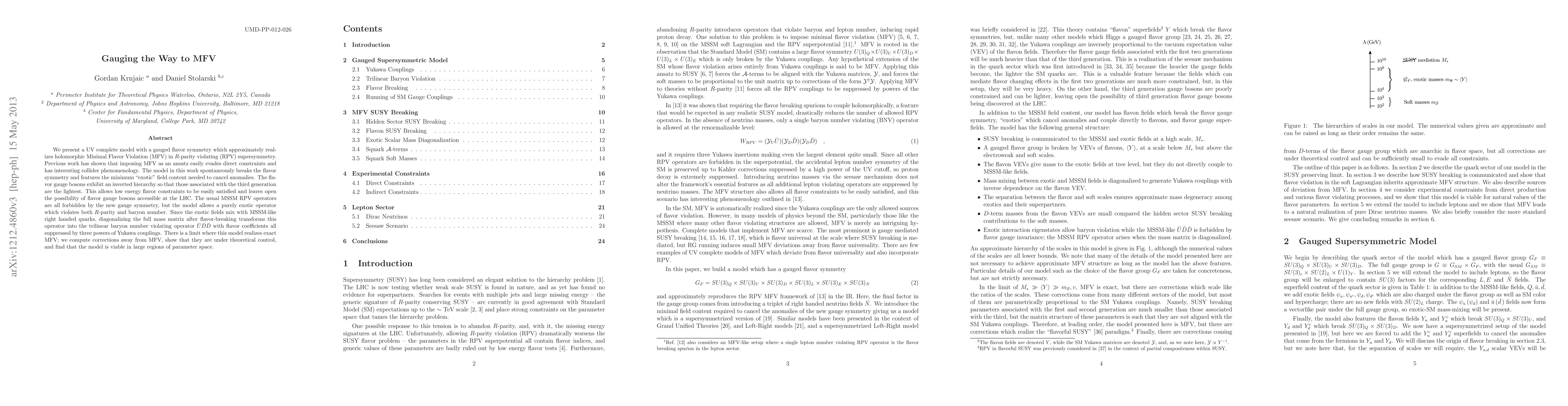 We present a UV complete model with a gauged flavor symmetry which approximately realizes holomorphic Minimal Flavor Violation (MFV) in R-parity violating (RPV) supersymmetry. Previous work has shown that imposing MFV as an ansatz easily evades direct constraints and has interesting collider phenomenology. The model in this work spontaneously breaks the flavor symmetry and features the minimum "exotic" field content needed to cancel anomalies. The flavor gauge bosons exhibit an inverted hierarchy so that those associated with the third generation are the lightest. This allows low energy flavor constraints to be easily satisfied and leaves open the possibility of flavor gauge bosons accessible at the LHC. The usual MSSM RPV operators are all forbidden by the new gauge symmetry, but the model allows a purely "exotic" operator which violates both R-parity and baryon number. Since the exotic fields mix with MSSM-like right handed quarks, diagonalizing the full mass matrix after flavor-breaking transforms this operator into the trilinear baryon number violating operator UDD with flavor coefficients all suppressed by three powers of Yukawa couplings. There is a limit where this model realizes exact MFV; we compute corrections away from MFV, show that they are under theoretical control, and find that the model is viable in large regions of parameter space.