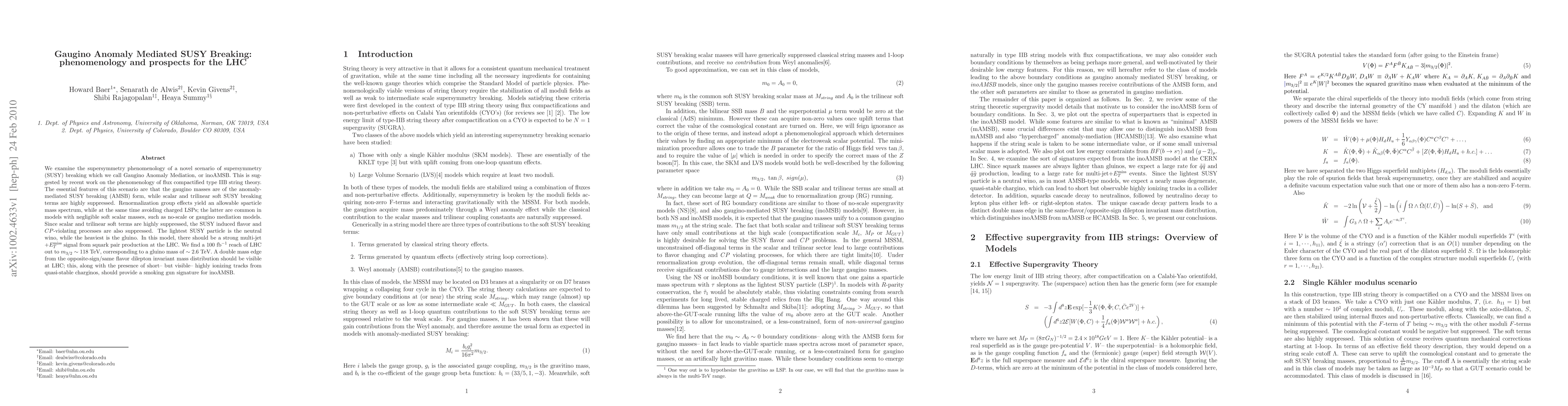 We examine the supersymmetry phenomenology of a novel scenario of supersymmetry (SUSY) breaking which we call Gaugino Anomaly Mediation, or inoAMSB. This is suggested by recent work on the phenomenology of flux compactified type IIB string theory. The essential features of this scenario are that the gaugino masses are of the anomaly-mediated SUSY breaking (AMSB) form, while scalar and trilinear soft SUSY breaking terms are highly suppressed. Renormalization group effects yield an allowable sparticle mass spectrum, while at the same time avoiding charged LSPs; the latter are common in models with negligible soft scalar masses, such as no-scale or gaugino mediation models. Since scalar and trilinear soft terms are highly suppressed, the SUSY induced flavor and CP-violating processes are also suppressed. The lightest SUSY particle is the neutral wino, while the heaviest is the gluino. In this model, there should be a strong multi-jet +etmiss signal from squark pair production at the LHC. We find a 100 fb^{-1} reach of LHC out to m_{3/2}\sim 118 TeV, corresponding to a gluino mass of \sim 2.6 TeV. A double mass edge from the opposite-sign/same flavor dilepton invariant mass distribution should be visible at LHC; this, along with the presence of short-- but visible-- highly ionizing tracks from quasi-stable charginos, should provide a smoking gun signature for inoAMSB.