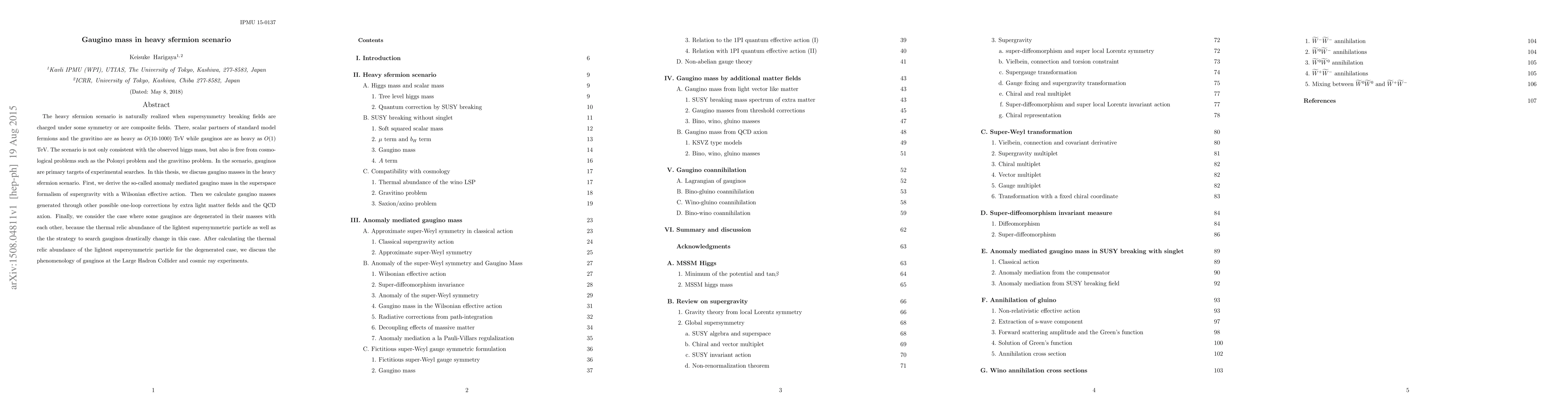 The heavy sfermion scenario is naturally realized when supersymmetry breaking fields are charged under some symmetry or are composite fields. There, scalar partners of standard model fermions and the gravitino are as heavy as O(10-1000) TeV while gauginos are as heavy as O(1) TeV. The scenario is not only consistent with the observed higgs mass, but also is free from cosmological problems such as the Polonyi problem and the gravitino problem. In the scenario, gauginos are primary targets of experimental searches. In this thesis, we discuss gaugino masses in the heavy sfermion scenario. First, we derive the so-called anomaly mediated gaugino mass in the superspace formalism of supergravity with a Wilsonian effective action. Then we calculate gaugino masses generated through other possible one-loop corrections by extra light matter fields and the QCD axion. Finally, we consider the case where some gauginos are degenerated in their masses with each other, because the thermal relic abundance of the lightest supersymmetric particle as well as the the strategy to search gauginos drastically change in this case. After calculating the thermal relic abundance of the lightest supersymmetric particle for the degenerated case, we discuss the phenomenology of gauginos at the Large Hadron Collider and cosmic ray experiments.