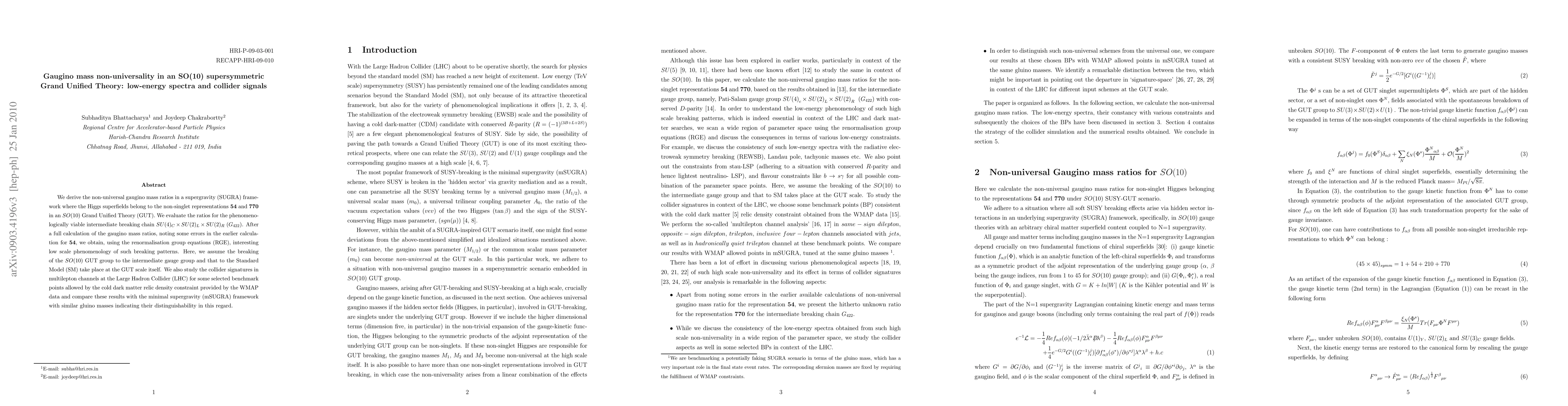 We derive the non-universal gaugino mass ratios in a supergravity (SUGRA) framework where the Higgs superfields belong to the non-singlet representations {\bf 54} and {\bf 770} in a SO(10) Grand Unified Theory (GUT). We evaluate the ratios for the phenomenologically viable intermediate breaking chain $SU(4)_C \times SU(2)_L \times SU(2)_R (G_{422})$. After a full calculation of the gaugino mass ratios, noting some errors in the earlier calculation for {\bf 54}, we obtain, using the renormalisation group equations (RGE), interesting low scale phenomenology of such breaking patterns. Here, we assume the breaking of the SO(10) GUT group to the intermediate gauge group and that to the Standard Model (SM) take place at the GUT scale itself. We also study the collider signatures in multilepton channels at the Large Hadron Collider (LHC) for some selected benchmark points allowed by the cold dark matter relic density constraint provided by the WMAP data and compare these results with the minimal supergravity (mSUGRA) framework with similar gluino masses indicating their distinguishability in this regard.