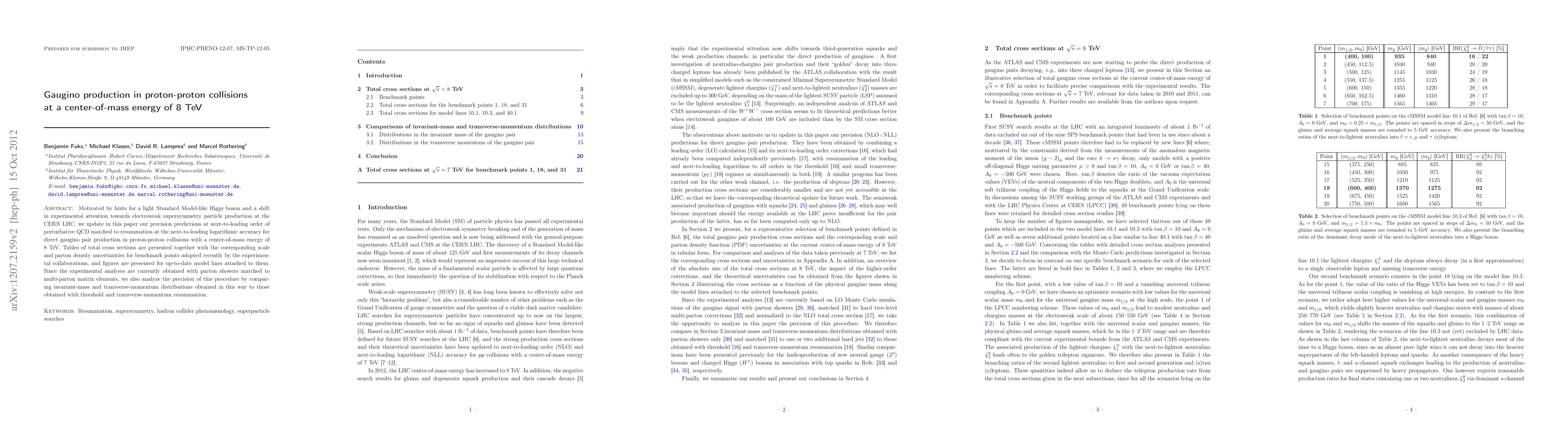 Motivated by hints for a light Standard Model-like Higgs boson and a shift in experimental attention towards electroweak supersymmetry particle production at the CERN LHC, we update in this paper our precision predictions at next-to-leading order of perturbative QCD matched to resummation at the next-to-leading logarithmic accuracy for direct gaugino pair production in proton-proton collisions with a center-of-mass energy of 8 TeV. Tables of total cross sections are presented together with the corresponding scale and parton density uncertainties for benchmark points adopted recently by the experimental collaborations, and figures are presented for up-to-date model lines attached to them. Since the experimental analyses are currently obtained with parton showers matched to multi-parton matrix elements, we also analyze the precision of this procedure by comparing invariant-mass and transverse-momentum distributions obtained in this way to those obtained with threshold and transverse-momentum resummation.