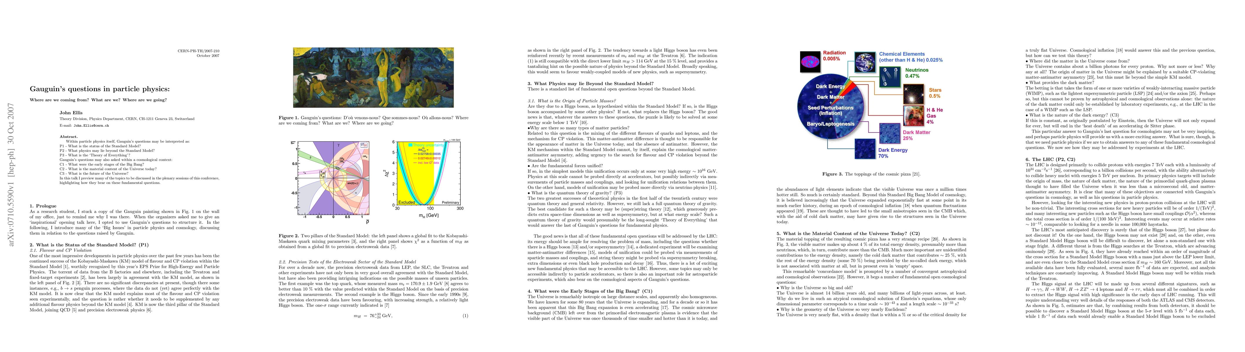 This paper explores how Gauguin's philosophical questions relate to contemporary particle physics and cosmology, focusing on the Standard Model's status, potential physics beyond it, and the quest for the Theory of Everything, alongside inquiries into the early universe, current material content, and future cosmic evolution.