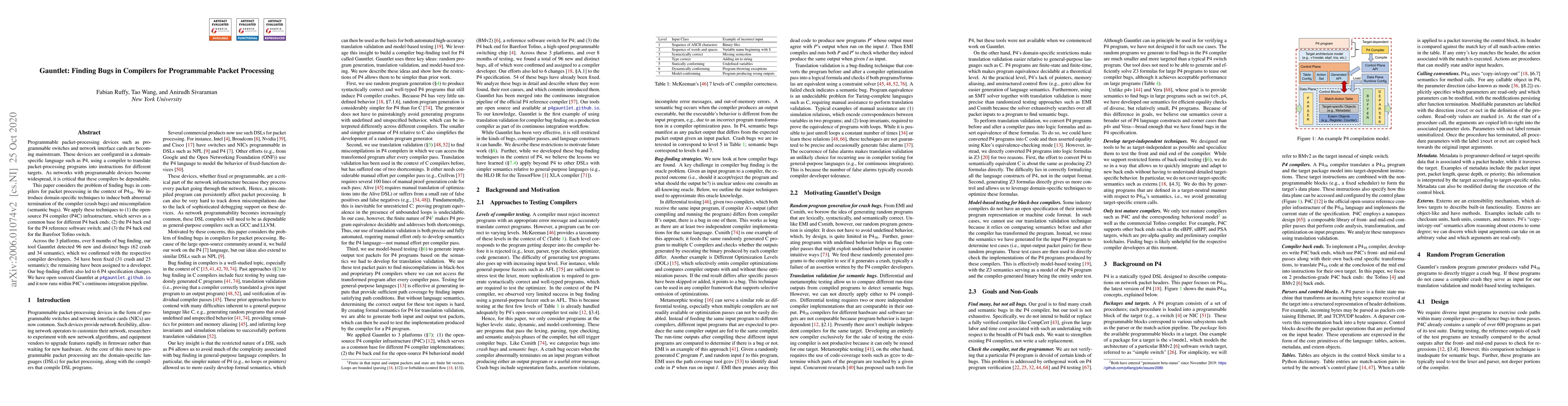 This paper presents Gauntlet, a tool for finding bugs in compilers for programmable packet processing, specifically targeting P4-16 compilers. Over 8 months, Gauntlet identified 96 new bugs in three P4 compilers, leading to 54 bug fixes and 6 P4 specification changes, and has been integrated into P4C's CI pipeline.