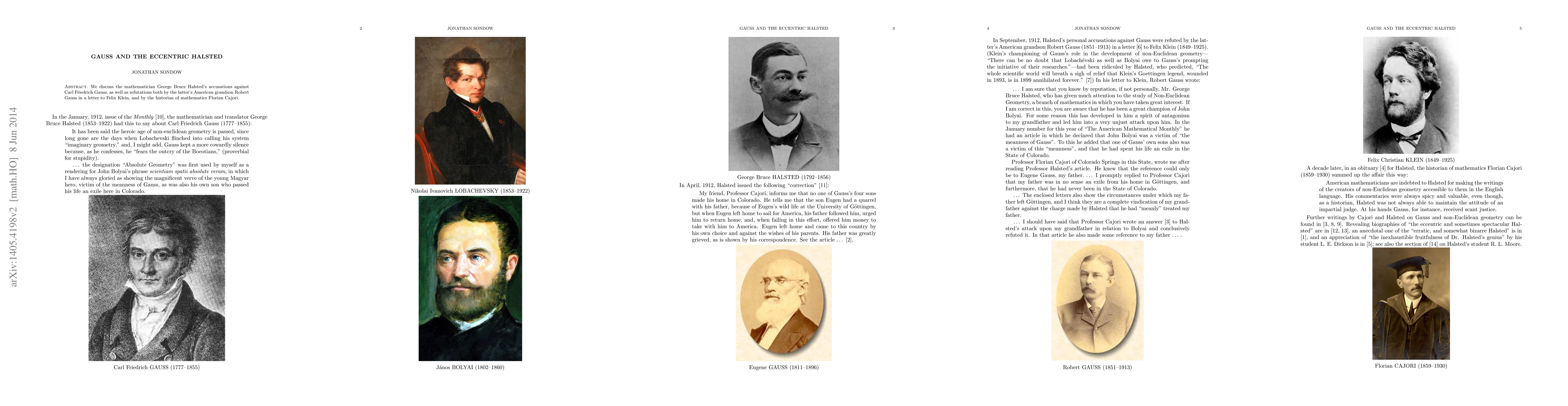 We discuss the mathematician George Bruce Halsted's accusations against Carl Friedrich Gauss, as well as refutations both by the latter's American grandson Robert Gauss in a letter to Felix Klein, and by the historian of mathematics Florian Cajori.