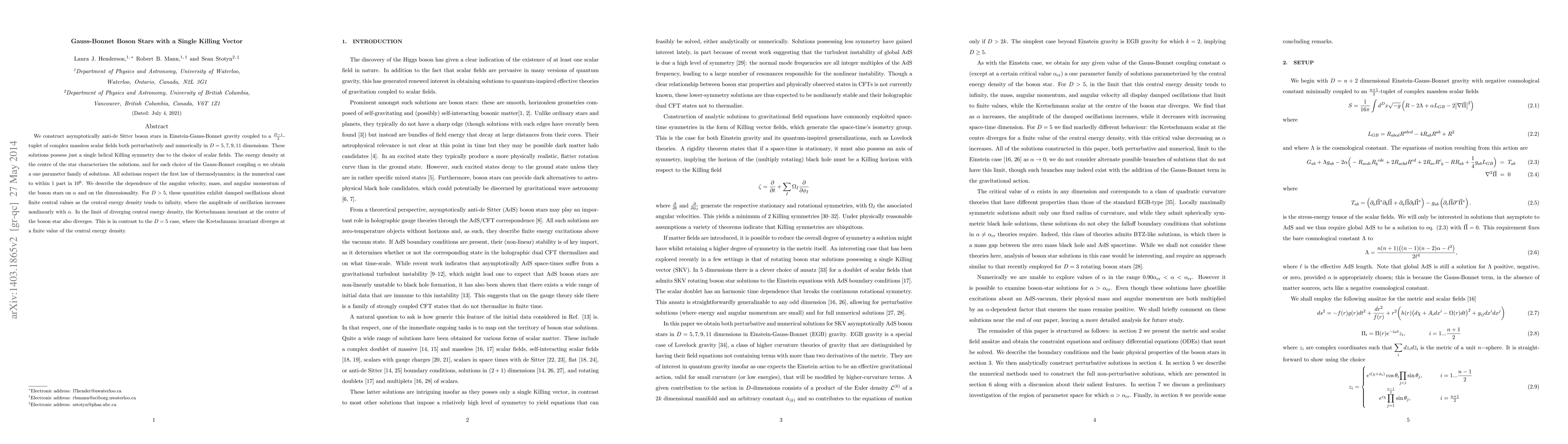 We construct asymptotically anti-de Sitter boson stars in Einstein-Gauss-Bonnet gravity coupled to a $\frac{D-1}{2}$-tuplet of complex massless scalar fields both perturbatively and numerically in D=5,7,9,11 dimensions. These solutions possess just a single helical Killing symmetry due to the choice of scalar fields. The energy density at the centre of the star characterizes the solutions, and for each choice of the Gauss-Bonnet coupling $\alpha$ we obtain a one parameter family of solutions. All solutions respect the first law of thermodynamics; in the numerical case to within 1 part in $10^6$. We describe the dependence of the angular velocity, mass, and angular momentum of the boson stars on $\alpha$ and on the dimensionality. For D>5, these quantities exhibit damped oscillations about finite central values as the central energy density tends to infinity, where the amplitude of oscillation increases nonlinearly with $\alpha$. In the limit of diverging central energy density, the Kretschmann invariant at the centre of the boson star also diverges. This is in contrast to the D=5 case, where the Kretschmann invariant diverges at a finite value of the central energy density.