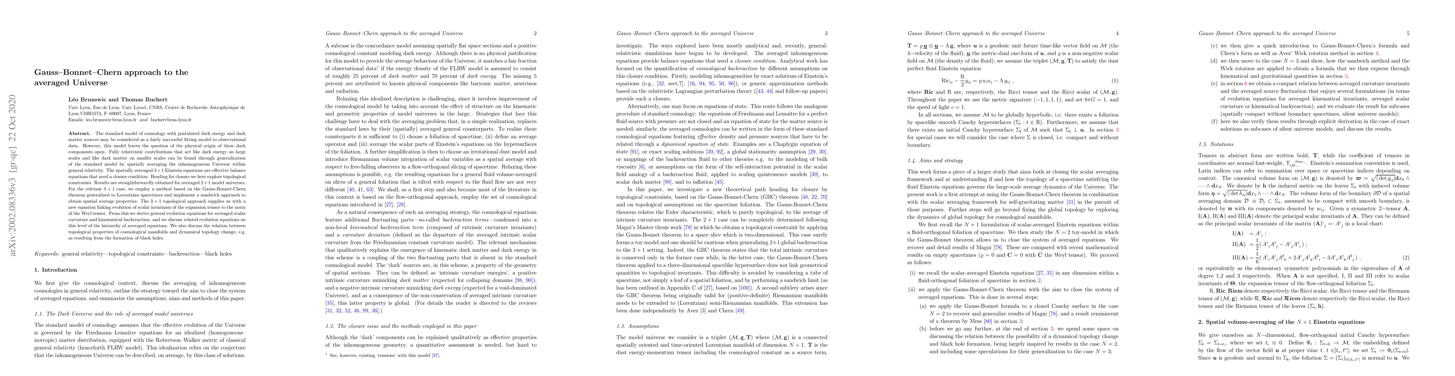 The standard model of cosmology with postulated dark energy and dark matter sources may be considered as a fairly successful fitting model to observational data. However, this model leaves the question of the physical origin of these dark components open. Fully relativistic contributions that act like dark energy on large scales and like dark matter on smaller scales can be found through generalization of the standard model by spatially averaging the inhomogeneous Universe within general relativity. The spatially averaged 3+1 Einstein equations are effective balance equations that need a closure condition. Heading for closure we here explore topological constraints. Results are straightforwardly obtained for averaged 2+1 model universes. For the relevant 3+1 case, we employ a method based on the Gauss-Bonnet-Chern theorem generalized to Lorentzian spacetimes and implement a sandwich approach to obtain spatial average properties. The 3+1 topological approach supplies us with a new equation linking evolution of scalar invariants of the expansion tensor to the norm of the Weyl tensor. From this we derive general evolution equations for averaged scalar curvature and kinematical backreaction, and we discuss related evolution equations on this level of the hierarchy of averaged equations. We also discuss the relation between topological properties of cosmological manifolds and dynamical topology change, e.g. as resulting from the formation of black holes.