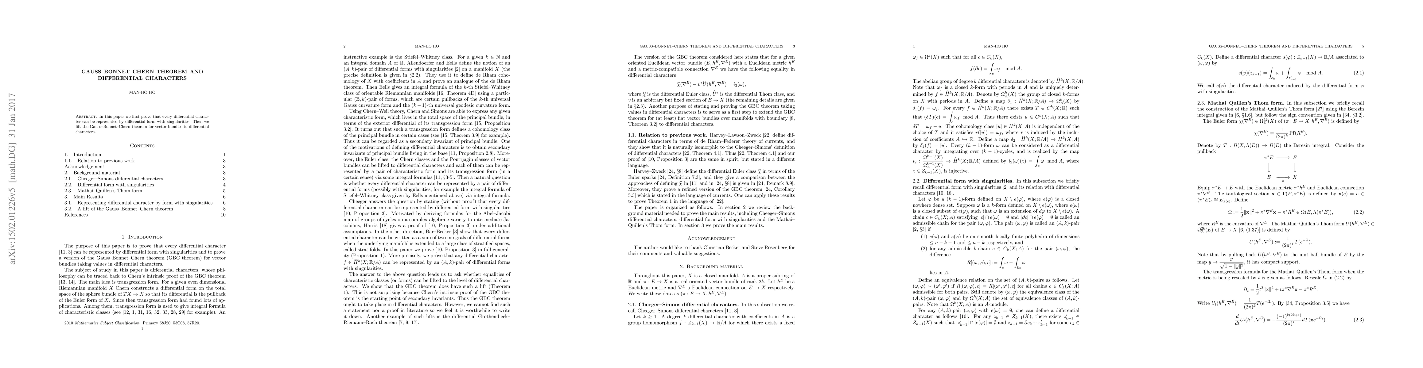 Summary: This research demonstrates that differential characters can be represented using singular differential forms and extends the Gauss-Bonnet-Chern theorem from vector bundles to differential characters.