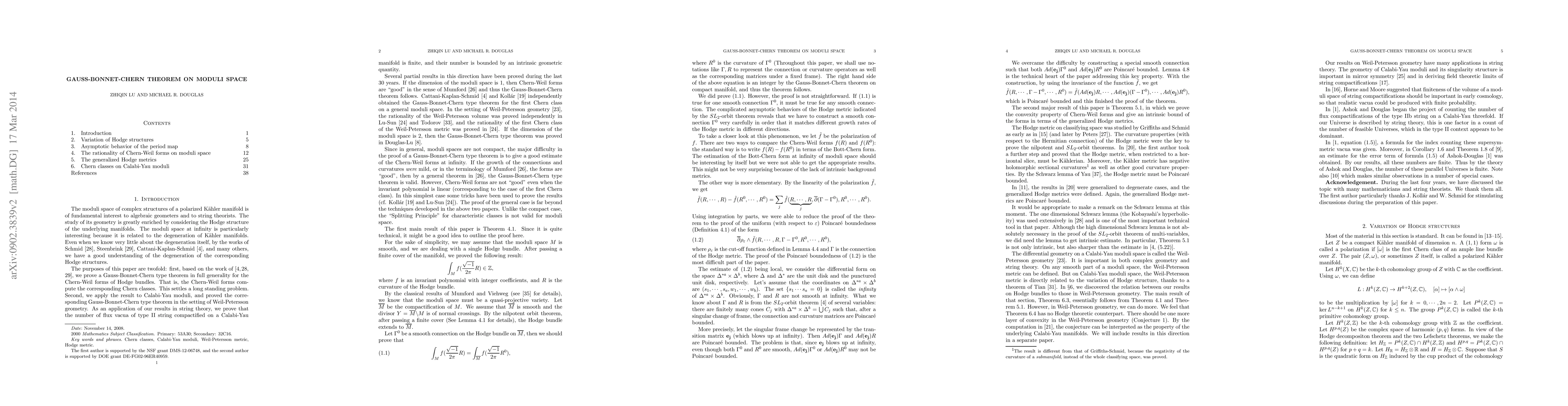 This paper proves the Gauss-Bonnet-Chern theorem for polarized Kähler manifolds in moduli space, establishing the rationality of Chern-Weil forms with respect to the Weil-Petersson metric on Calabi-Yau moduli. It also demonstrates the finiteness and rationality of integrals of these forms in the context of type IIb string theory flux compactifications.
