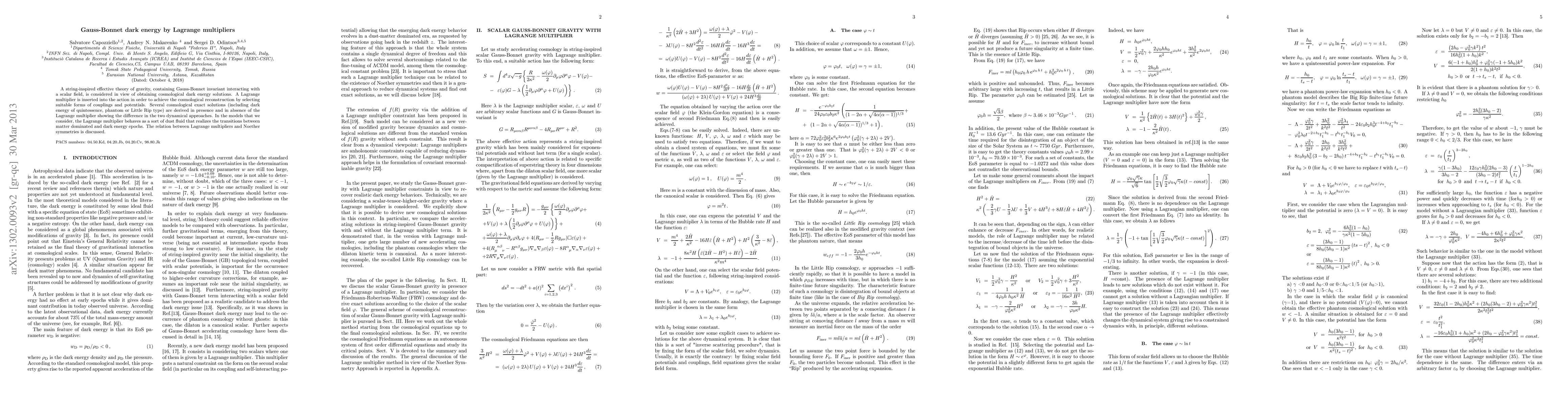 This paper explores a string-inspired gravity model with Gauss-Bonnet and scalar fields to derive cosmological dark energy solutions. It uses a Lagrange multiplier to reconstruct the cosmological model, deriving exact solutions for different dark energy types, and discusses the role of the Lagrange multiplier as a dust fluid facilitating transitions between epochs.