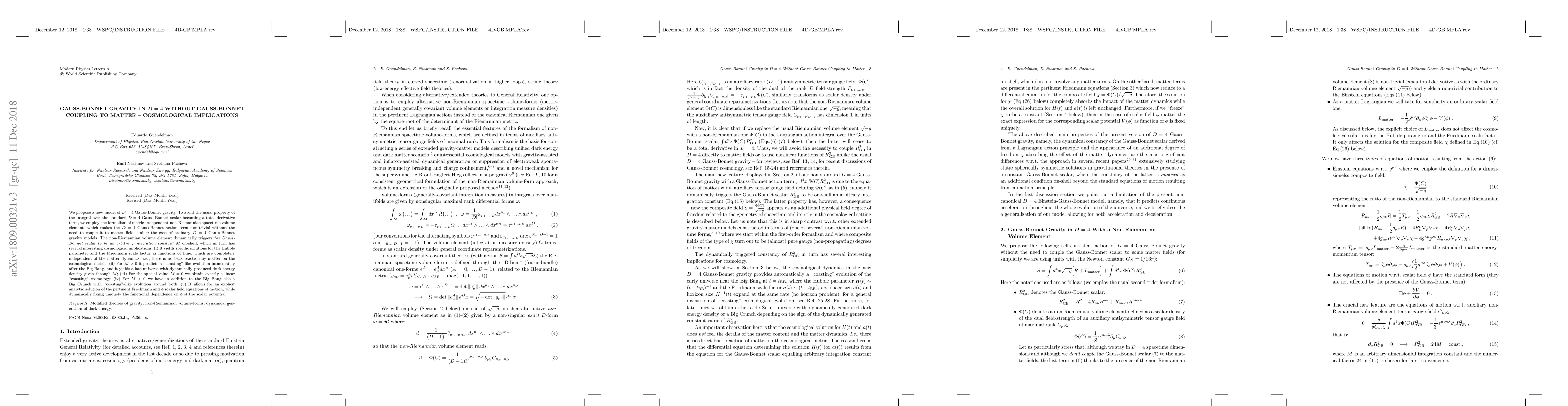 This paper proposes a novel $D=4$ Gauss-Bonnet gravity model that avoids coupling the Gauss-Bonnet term to matter, leading to unique cosmological implications including independent solutions for the Hubble parameter and Friedmann scale factor, a "coasting"-like evolution post-Big Bang, and potential Big Crunch scenarios.