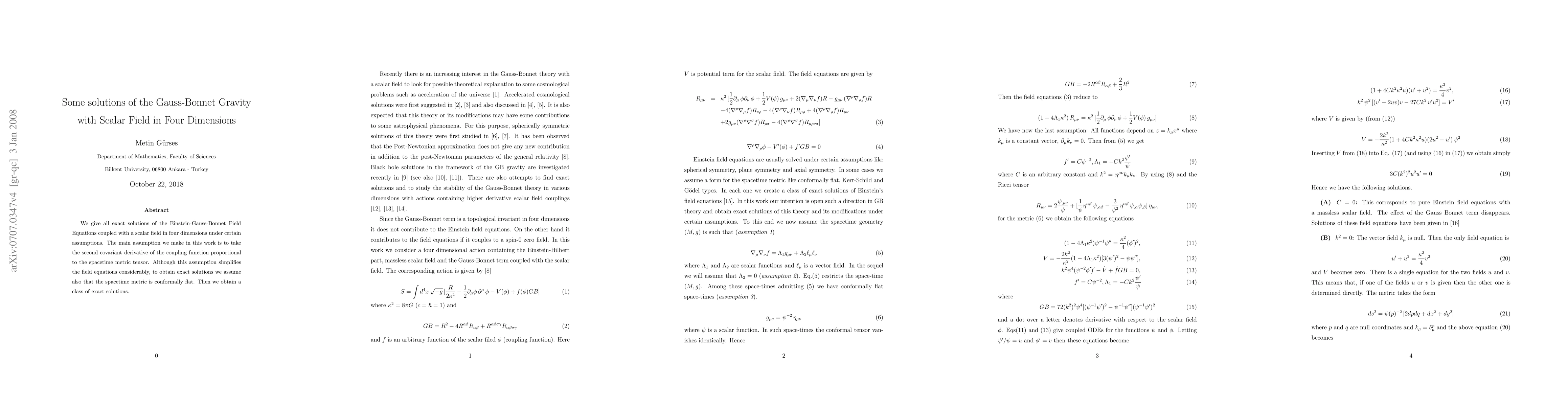 We give all exact solutions of the Einstein-Gauss-Bonnet Field Equations coupled with a scalar field in four dimensions under certain assumptions.
