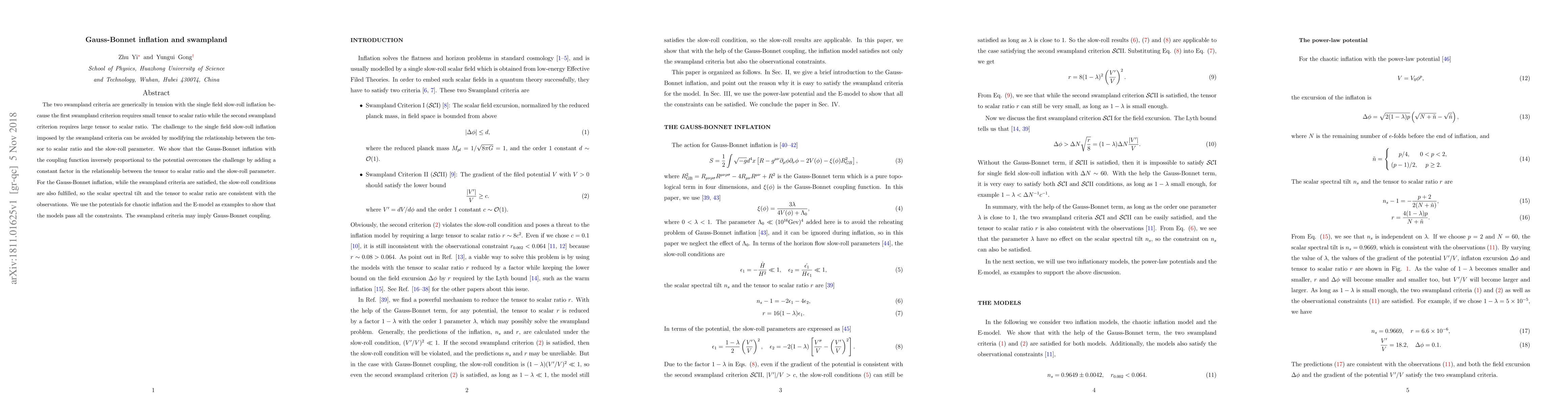 The two swampland criteria are generically in tension with the single field slow-roll inflation because the first swampland criterion requires small tensor to scalar ratio while the second swampland criterion requires large tensor to scalar ratio. The challenge to the single field slow-roll inflation imposed by the swampland criteria can be avoided by modifying the relationship between the tensor to scalar ratio and the slow-roll parameter. We show that the Gauss-Bonnet inflation with the coupling function inversely proportional to the potential overcomes the challenge by adding a constant factor in the relationship between the tensor to scalar ratio and the slow-roll parameter. For the Gauss-Bonnet inflation, while the swampland criteria are satisfied, the slow-roll conditions are also fulfilled, so the scalar spectral tilt and the tensor to scalar ratio are consistent with the observations. We use the potentials for chaotic inflation and the E-model as examples to show that the models pass all the constraints. The swampland criteria may imply Gauss-Bonnet coupling.